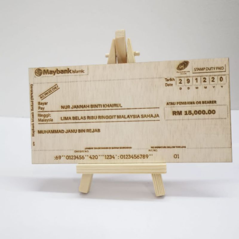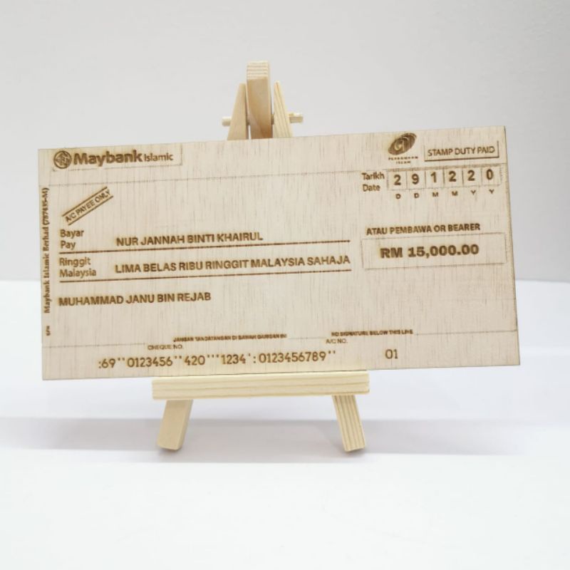 Replika kayu cek hantaran / wooden cheque laser engrave