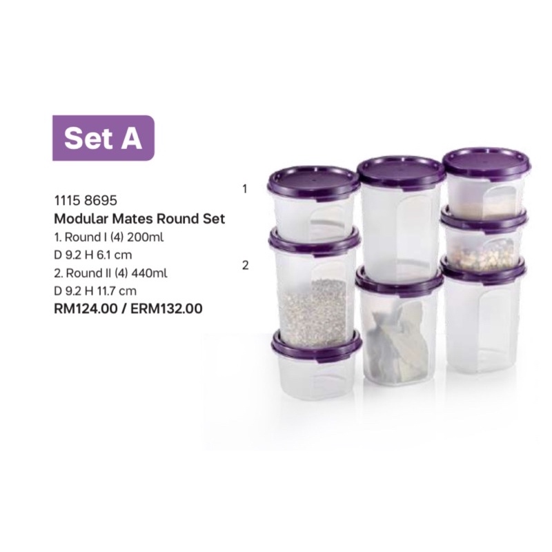 Retail RM124~ Tupperware Modular Mate Round 8PCS Set/ Tupperware Smart Saver Modular Mate 8pcs Purple Set dry Food #box
