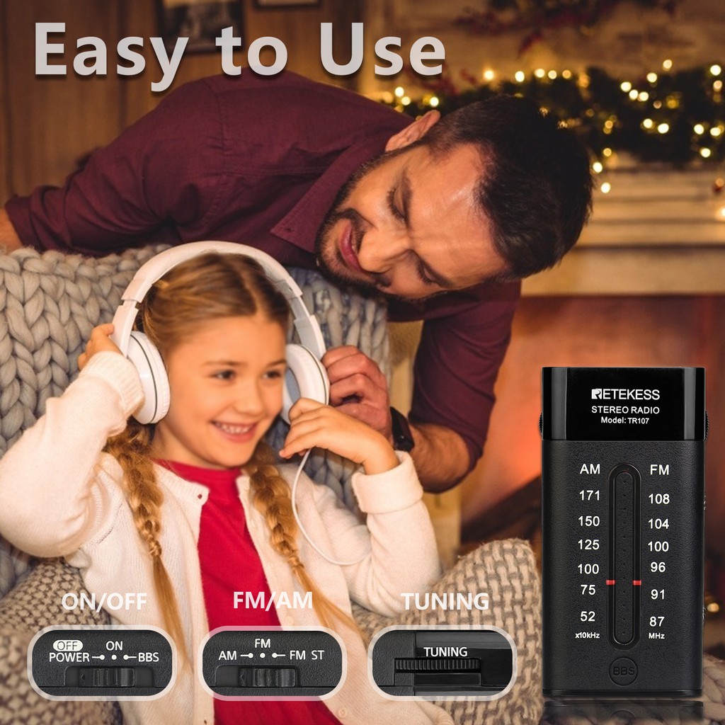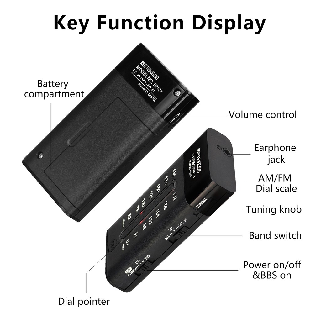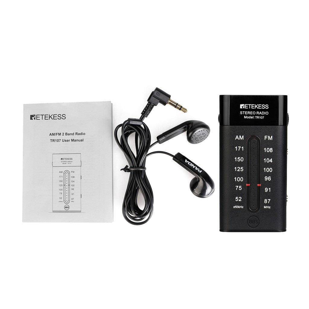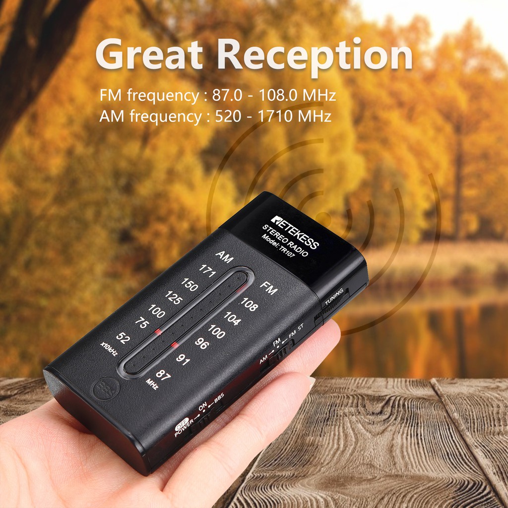 Retekess TR107 Mini Portable Pocket Radio Fm Am Pointer Tuning Stereo Stand Bbs Mega Bass with Hiking Headphone