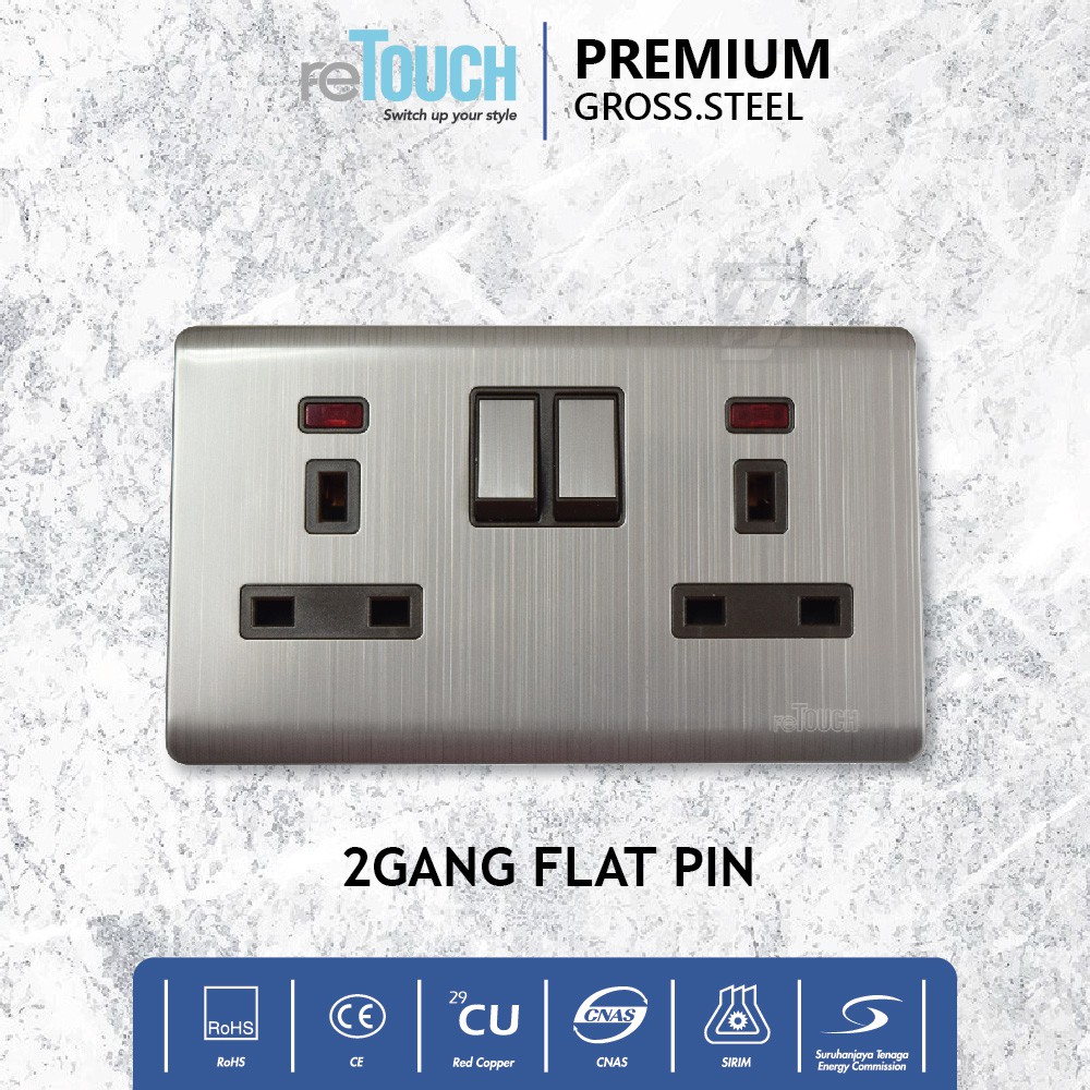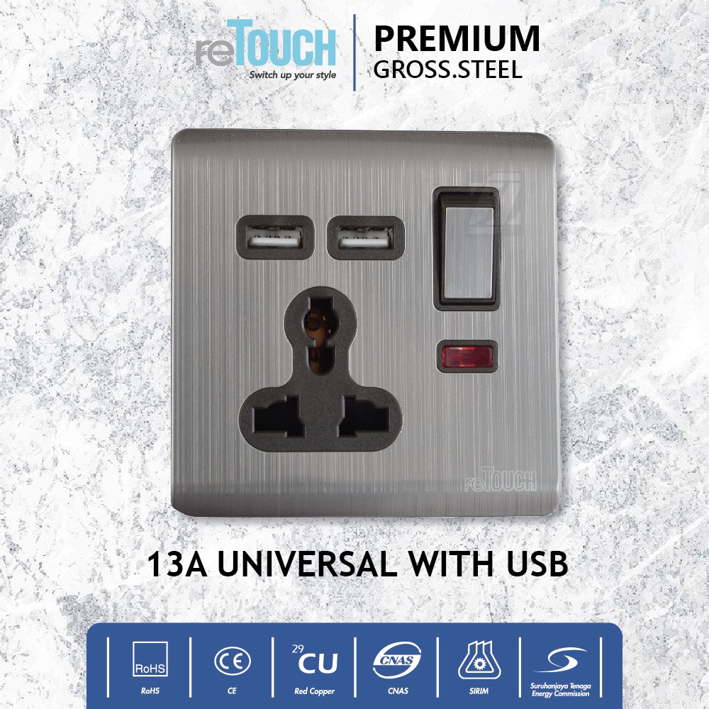 Retouch Premium Gross Steel Aluminium Socket 13A Universal USB, 2G 13A Flat Pin Wall Switch Socket