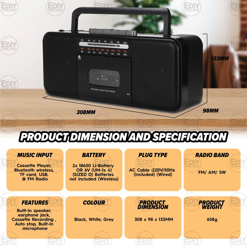 Retro Muji Boombox Cassette Player Recorder + FM Radio + Bluetooth Speaker Rechargeable Tape USB supersonic Kaset Bass