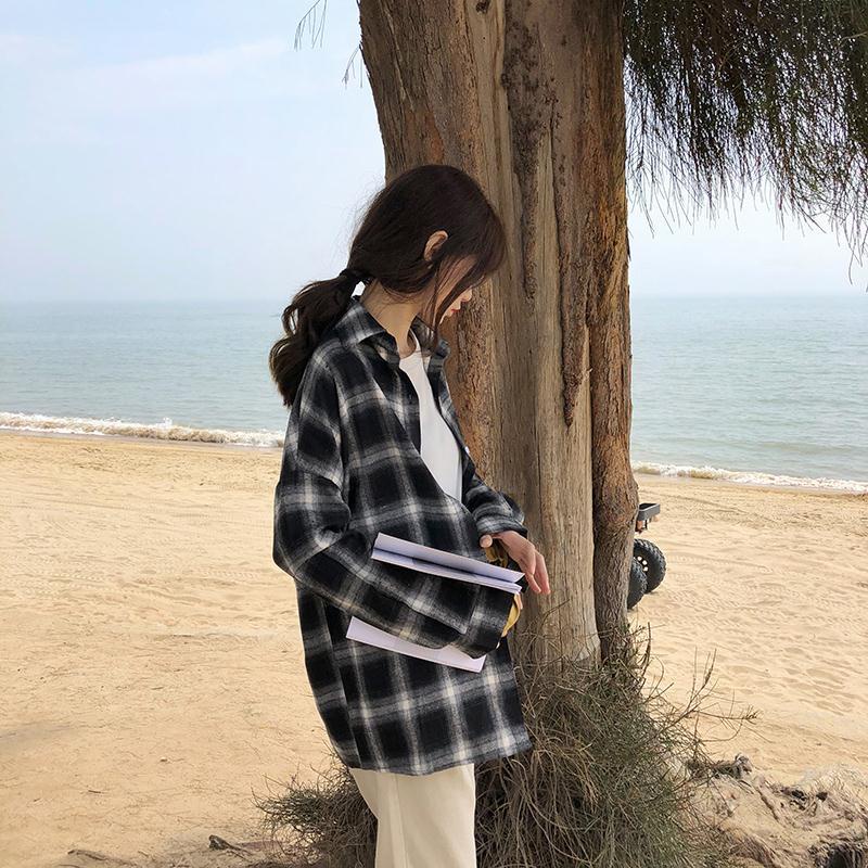 Retro Plaid Shirt Early Autumn New Korean Style Loose Polo Hong Kong Style Coat Student Women 's Shirt