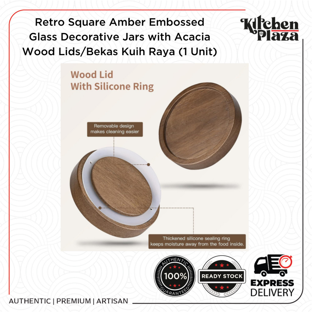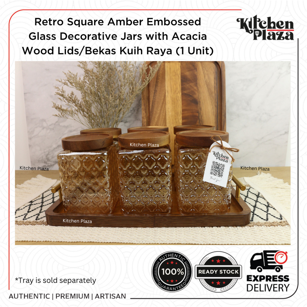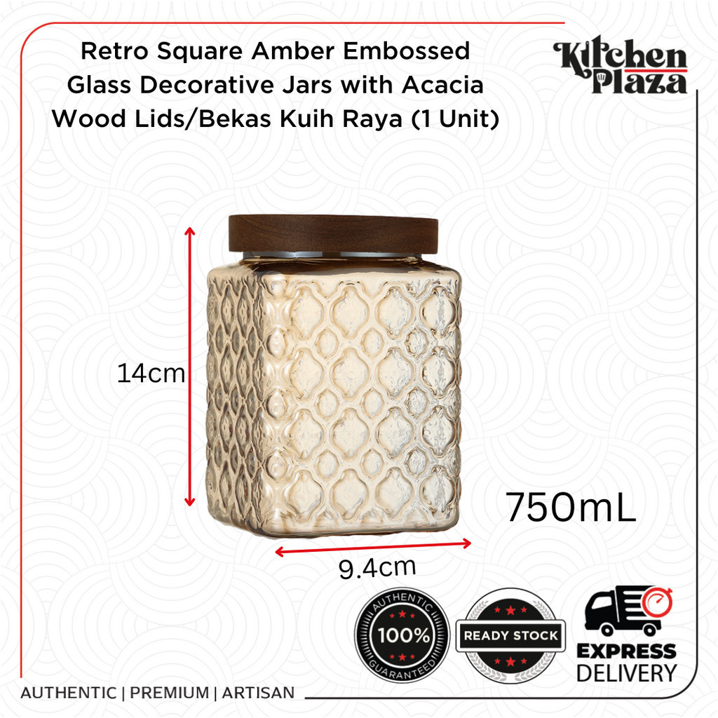 Retro Vintage Square Amber Embossed Glass Decorative Jars with Acacia Wood Lids/Bekas Kuih Raya (1 Unit)