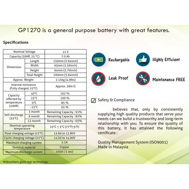 Rm 5 voucher FAST SHIPPING GP GPower GP1270 12V 7.0AH Rechargeable Seal Lead Acid Autogate UPS CCTV