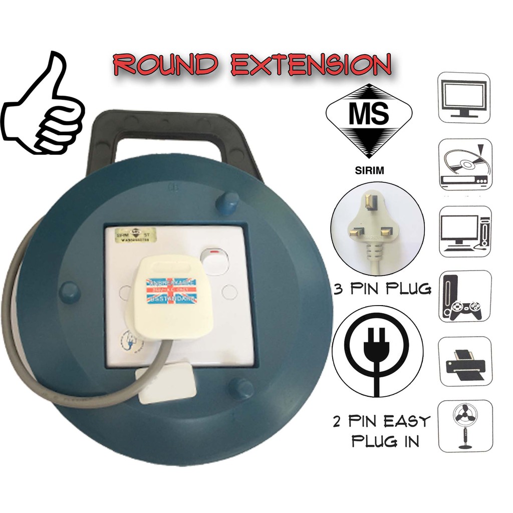 Round 1 Way Trailing Extension Socket Plug Adapter (5M/7M/10M/12M) - Sirim Certified/2 Pin Friendly/Fused & Save To Use