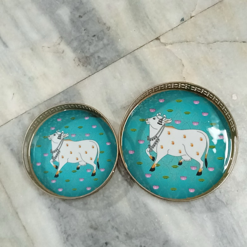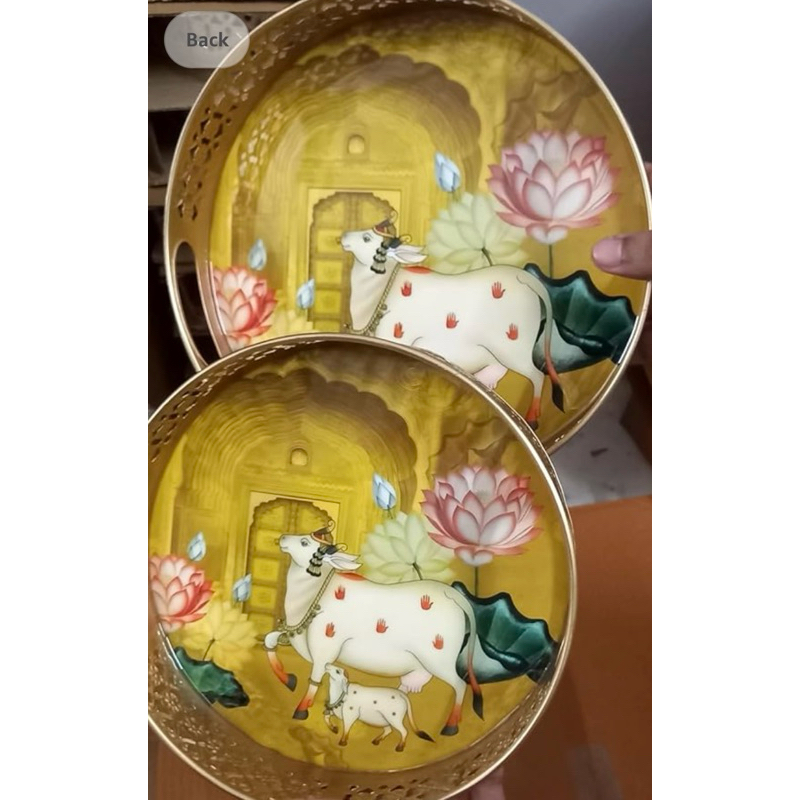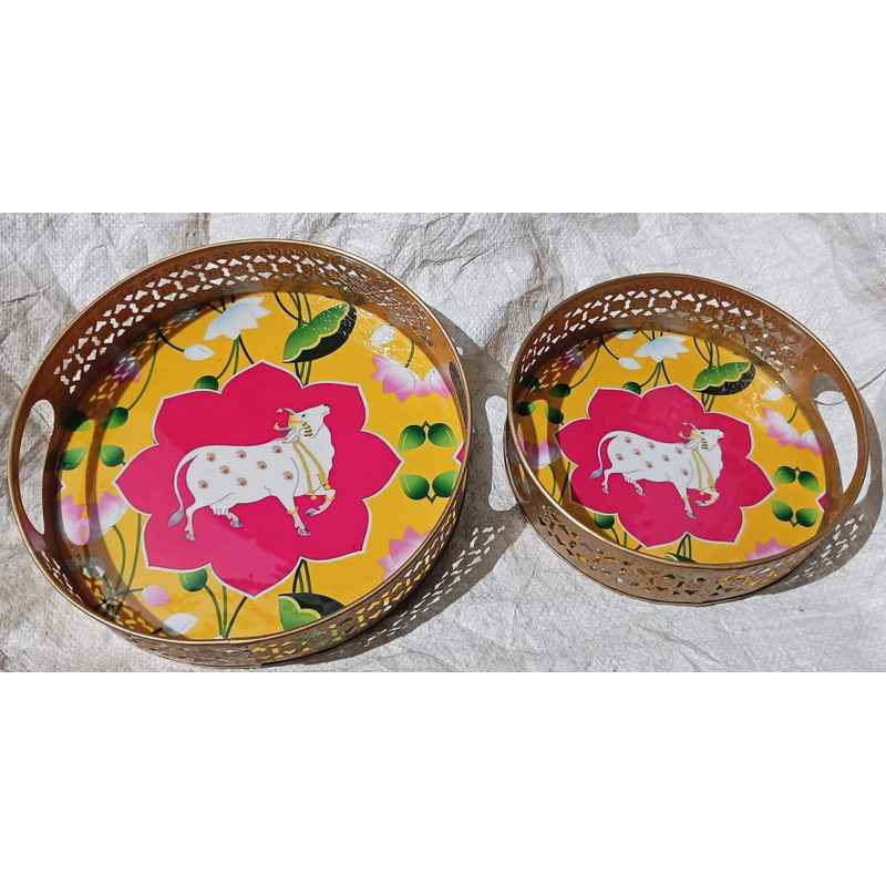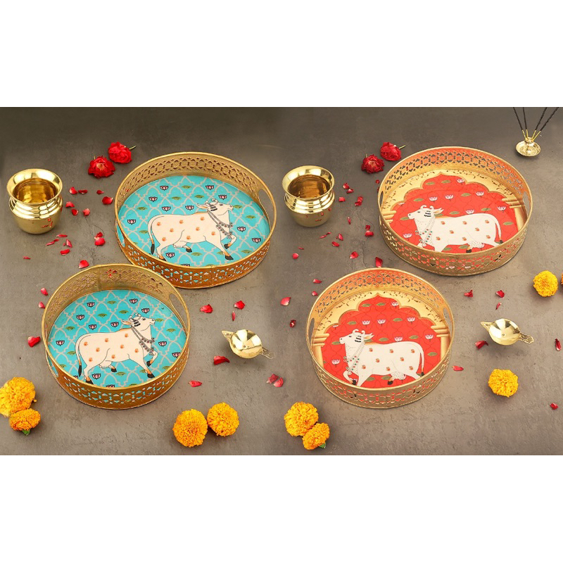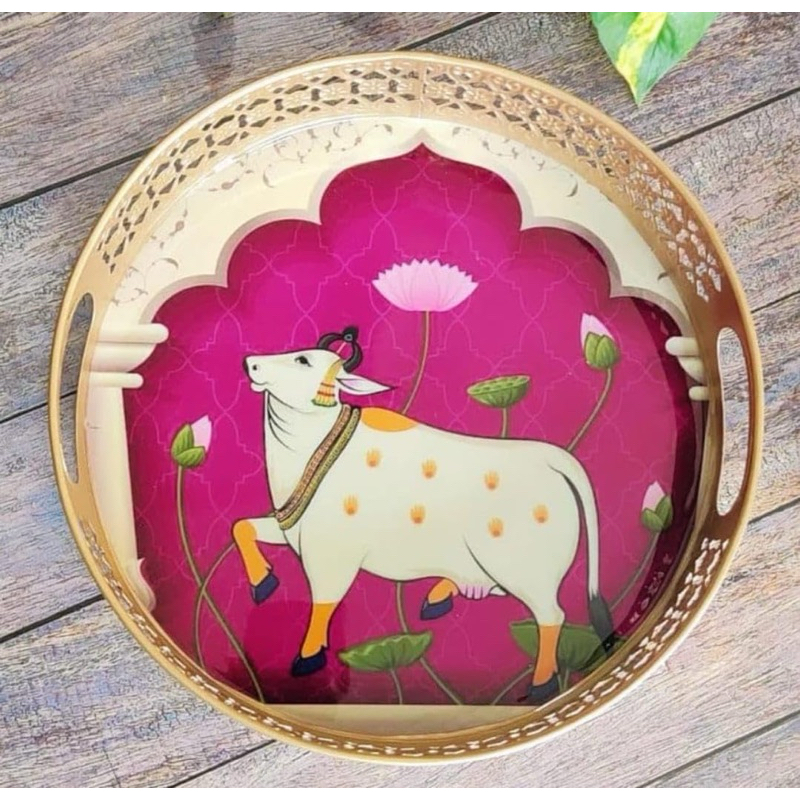 Round Metal Tray with Pichwai Art of Nandi | Cow Pichwai Tray (2in1)