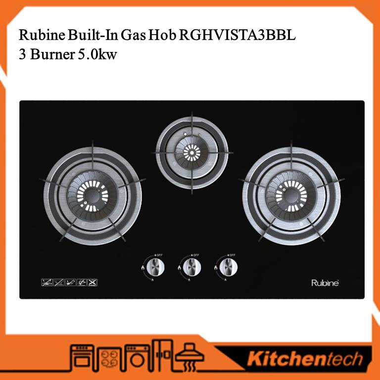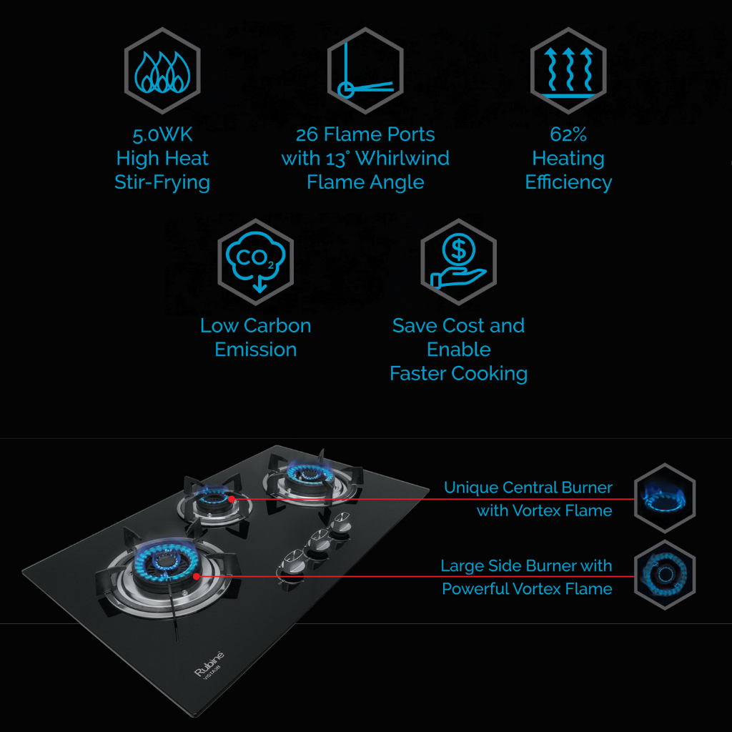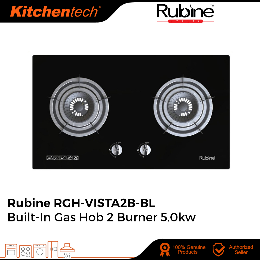 Rubine VISTA Built-in Black Tempered Glass Gas Hob 2 Burner 5.0kW Vortex Flame Burner - RGH-VISTA2B-BL / RGH-VISTA3B-BL