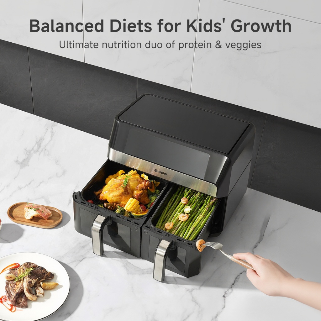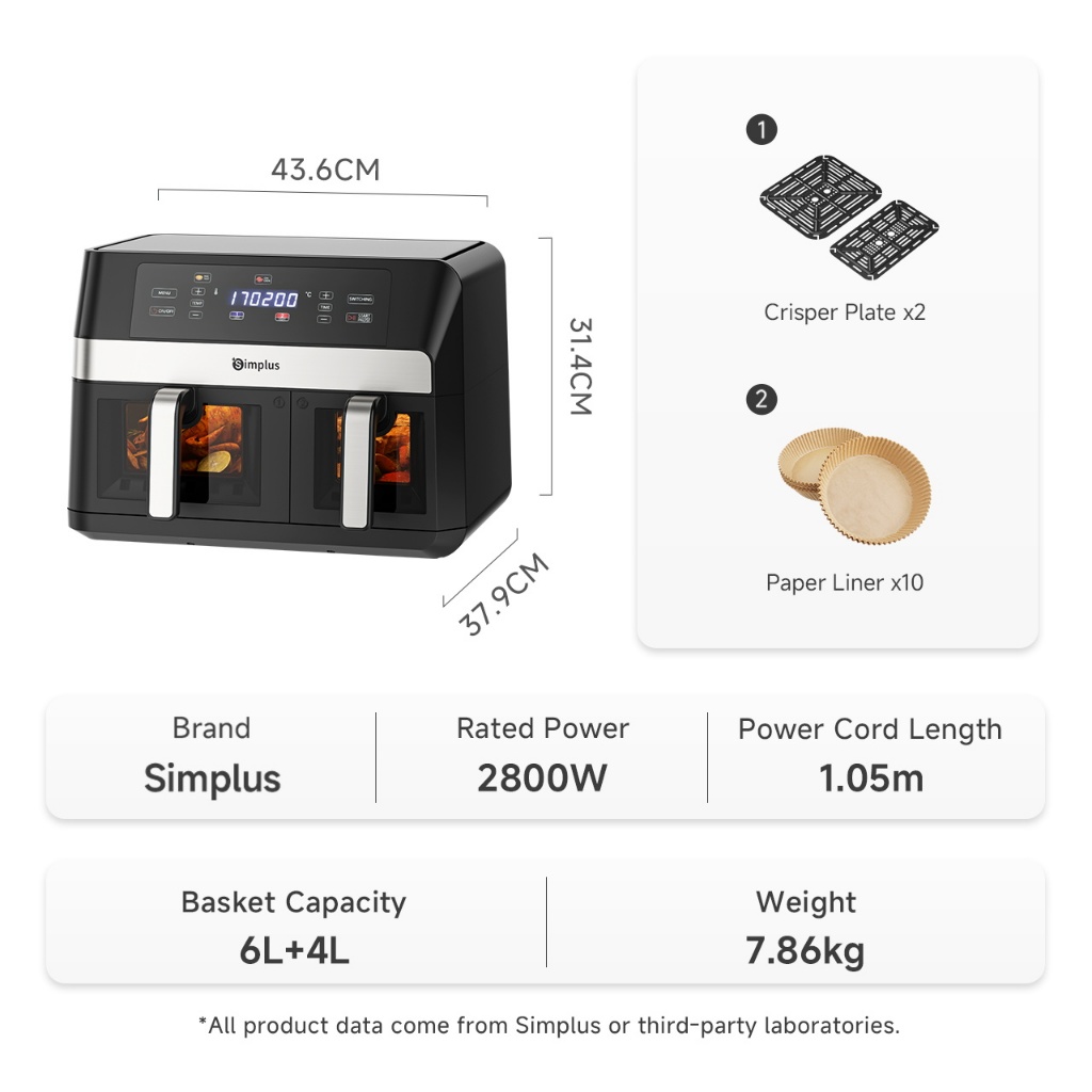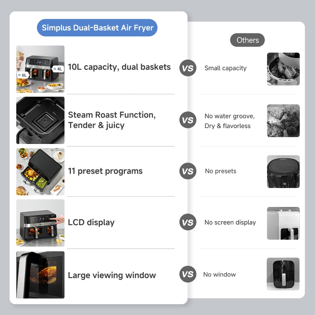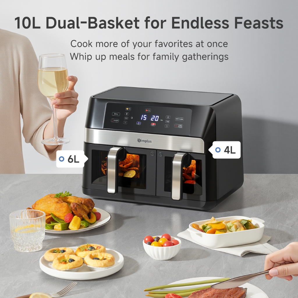 Simplus 13-in-1 Air Fryer | Dual Baskets | 10L Ultra Large Capacity | LCD Screen | 11 Preset Programs | Viewing Window | Less Fat KQZG020