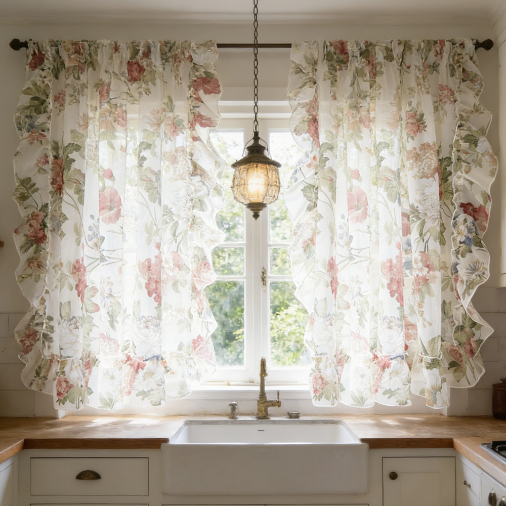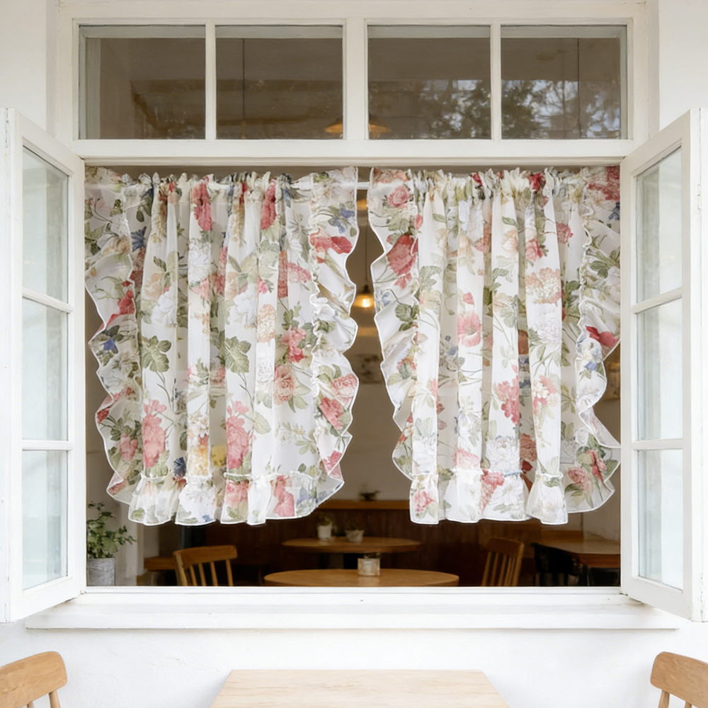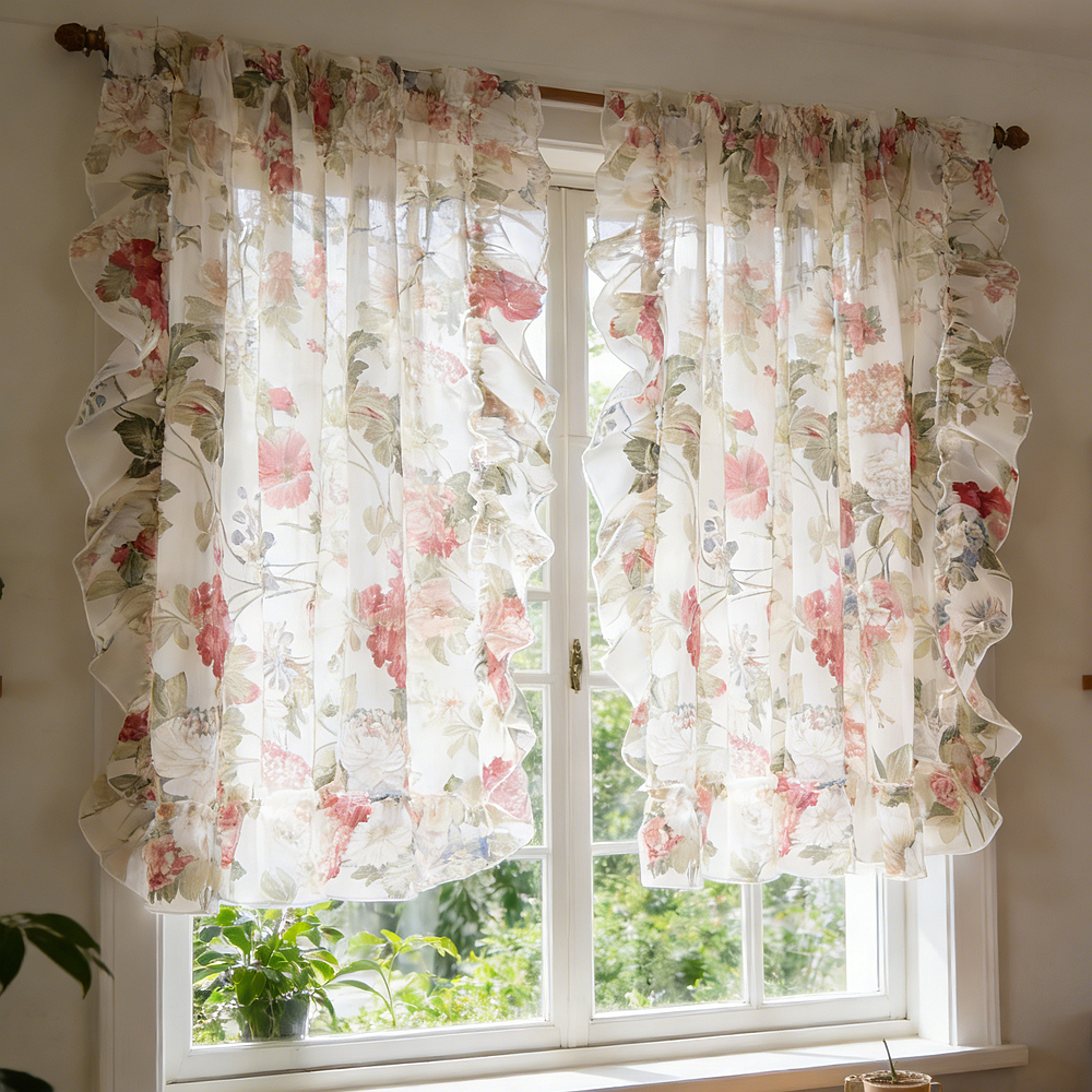 Rural Flower Leaf Printed Ruffle Sheer Curtains Privacy Semi Transparent Light Filtering Romantic Short Curtains Kitchen Half Curtain Sliding Door