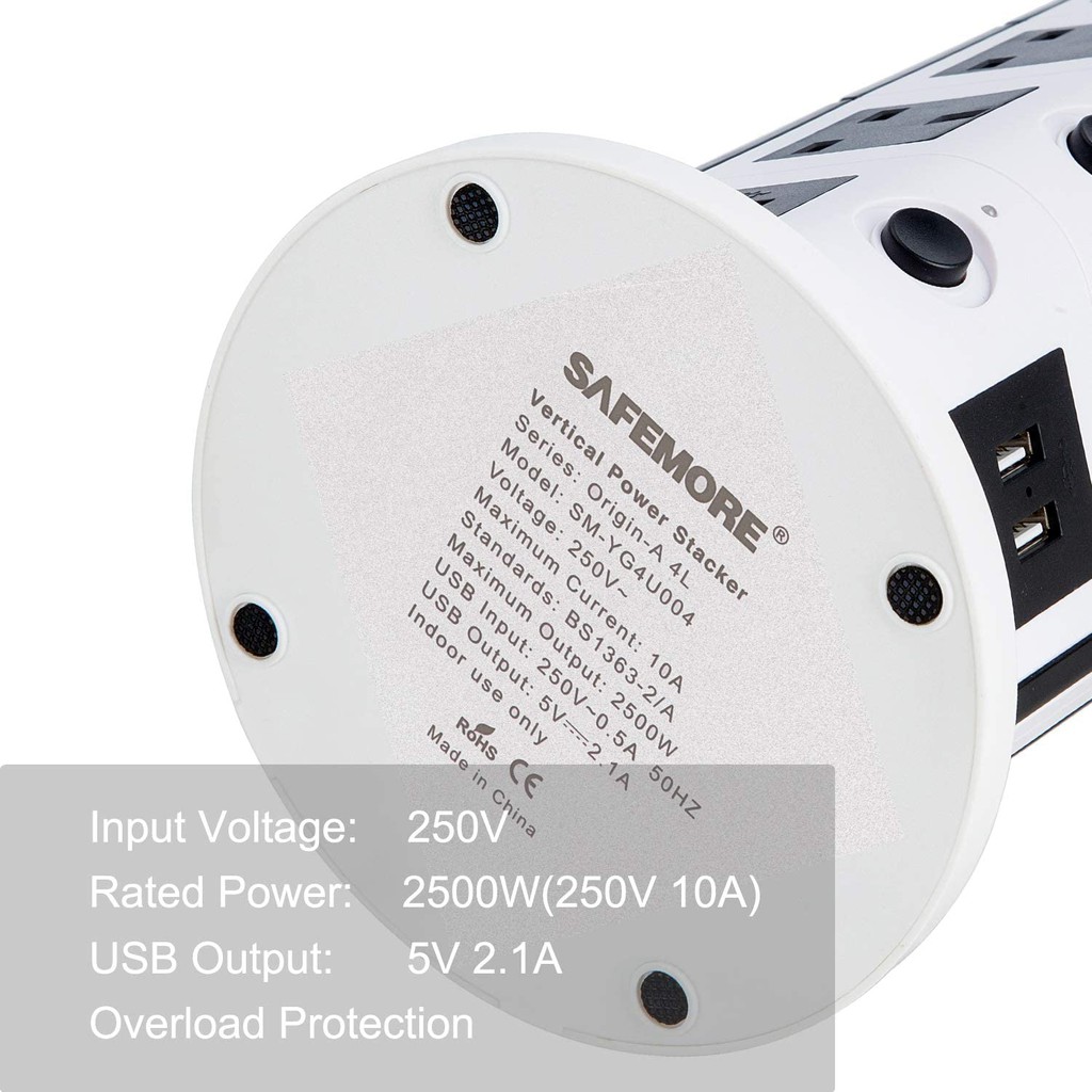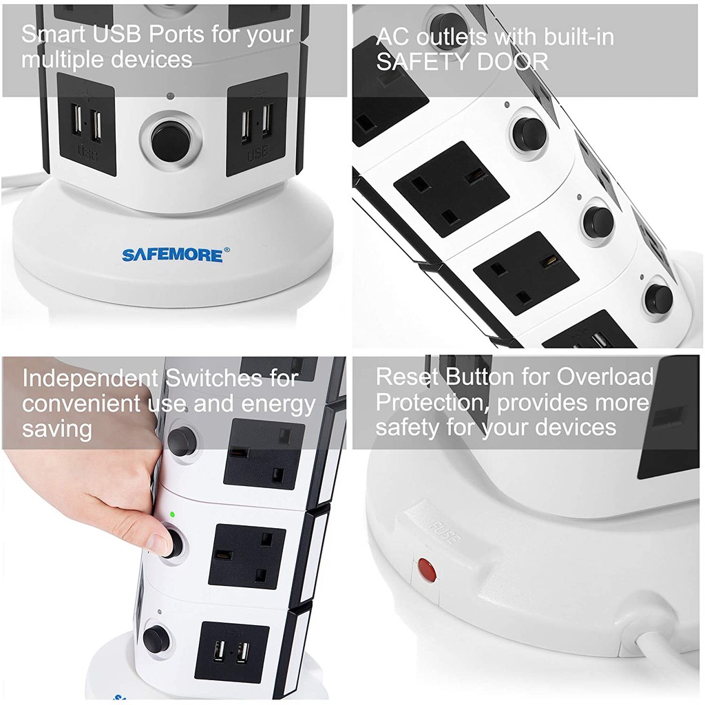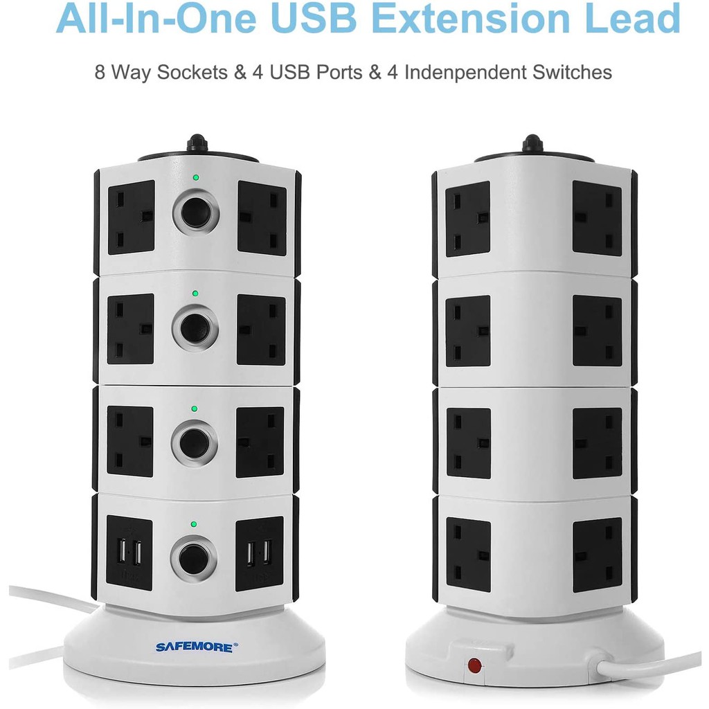 SAFEMORE Tower Extension Lead Individually Switched Plug Socket 14 outlet+4 USB Power Strip Station Overload Protection