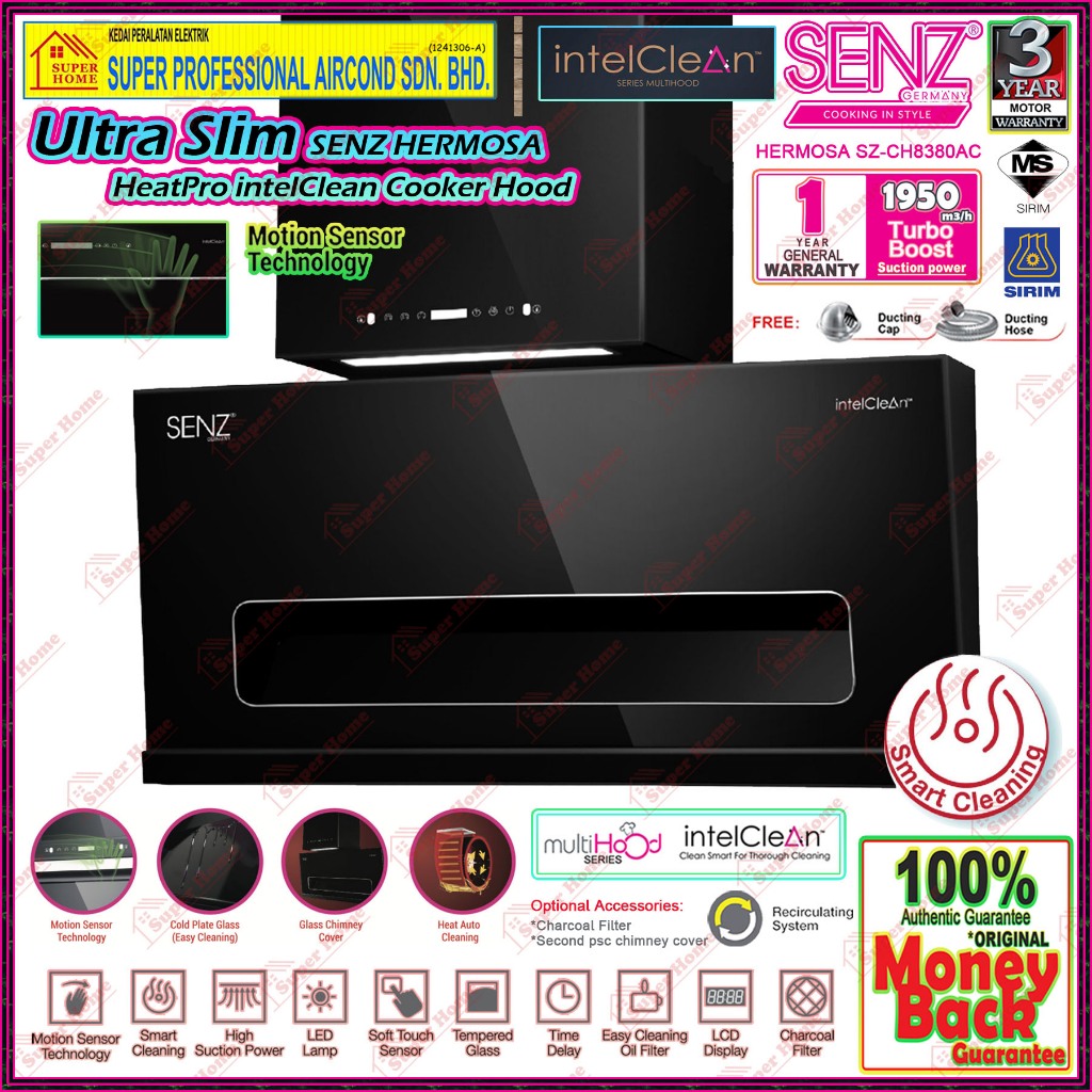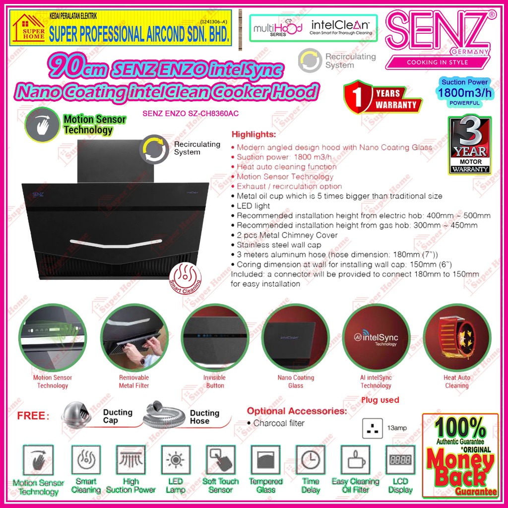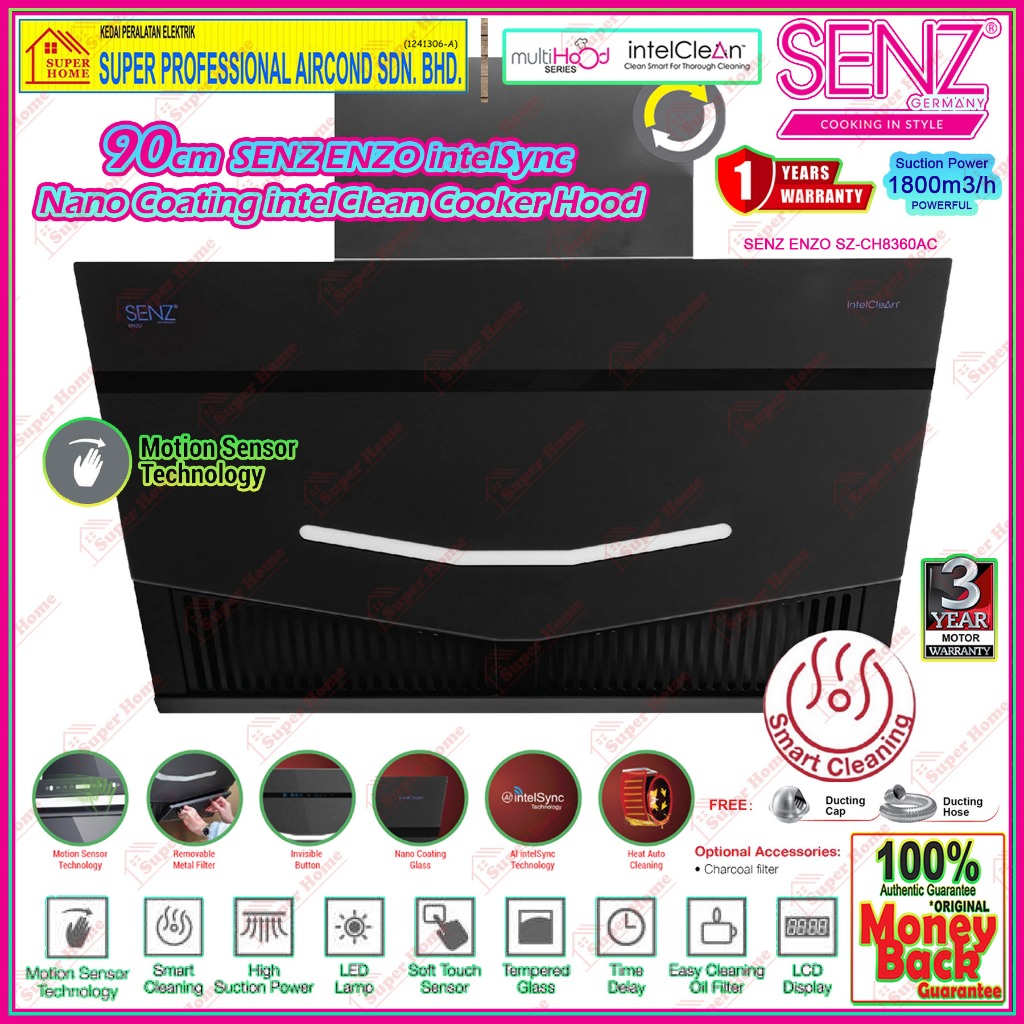 SENZ Cooker Hood SENZ ENZO SZ-CH8360AC with Nano Coating Glass Panel / HERMOSA SZ-CH8380AC