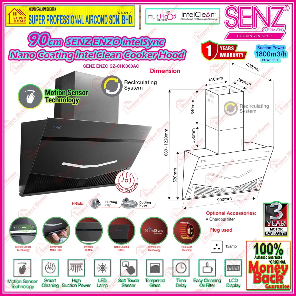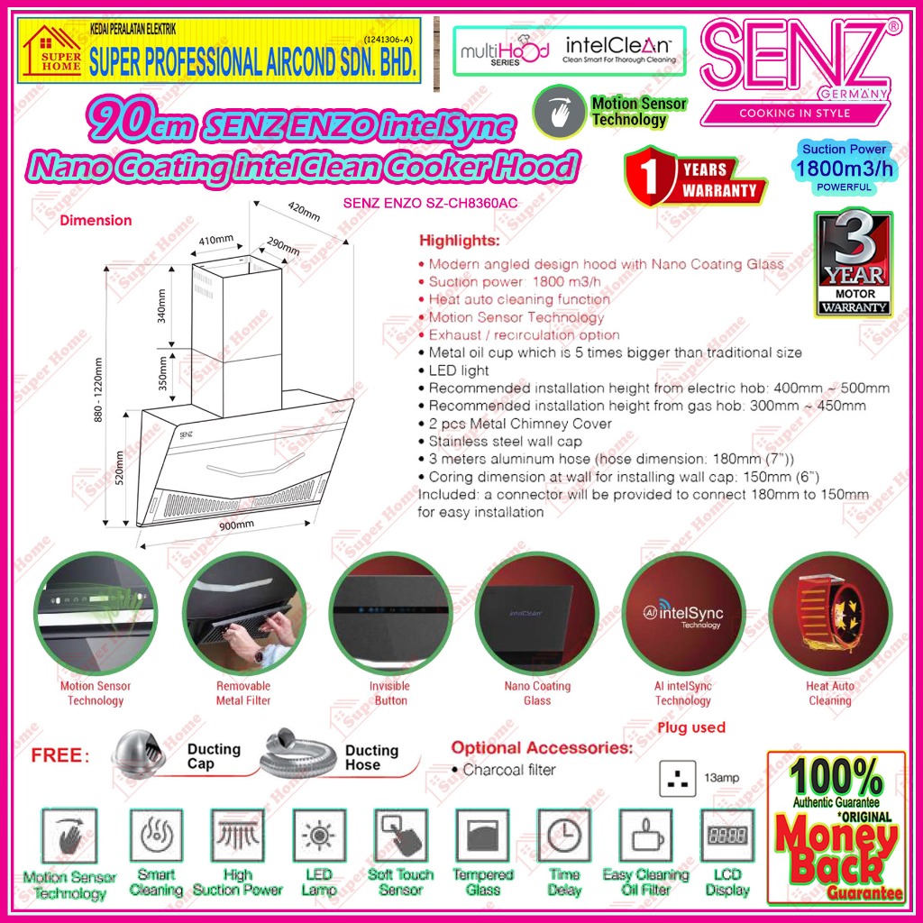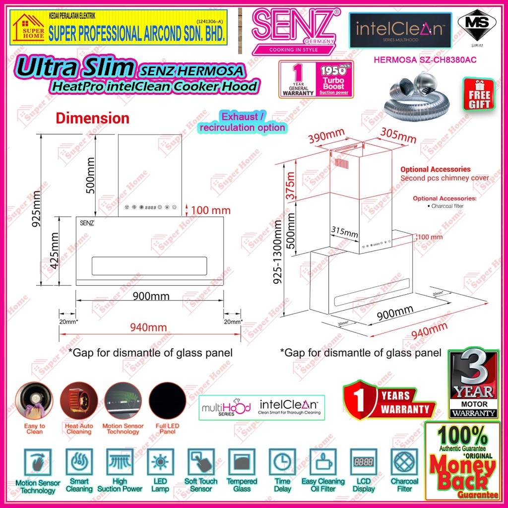 SENZ Cooker Hood SENZ ENZO SZ-CH8360AC with Nano Coating Glass Panel / HERMOSA SZ-CH8380AC