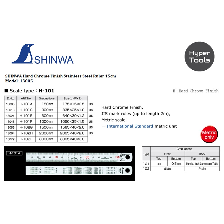 SHINWA Hard Chrome Finish Stainless Steel Ruler 15cm - Model: 13005