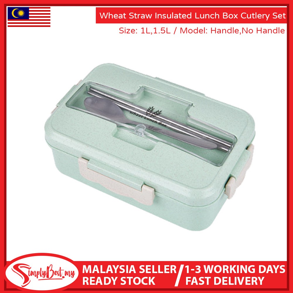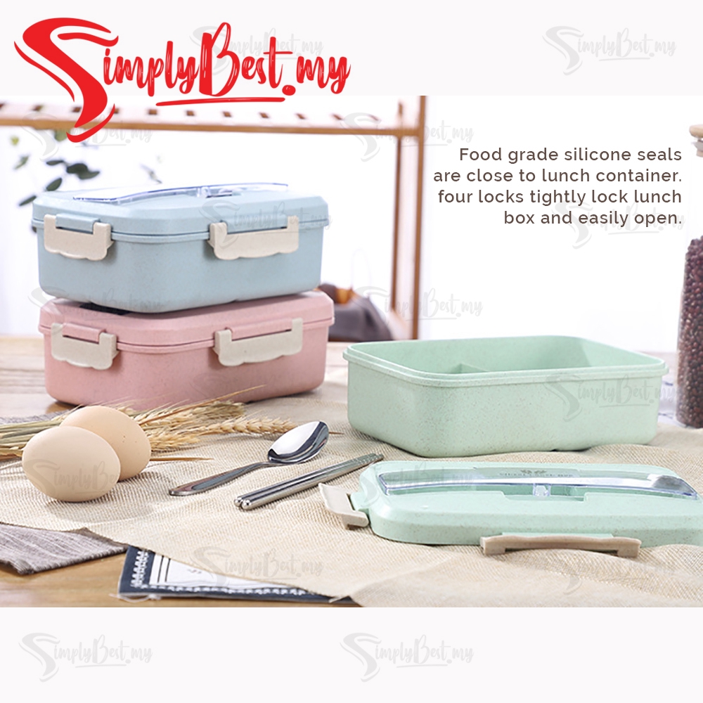 SIMPLYBEST Wheat Straw Lunch Box Set Free Stainless Steel Spoon and Chopsticks 3 Partitions Microwave safe Lunch Box