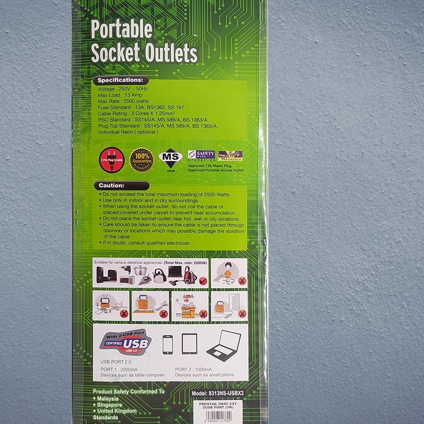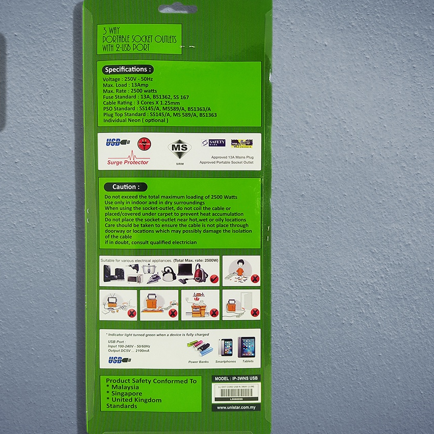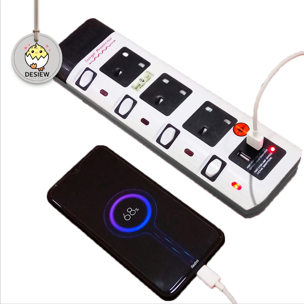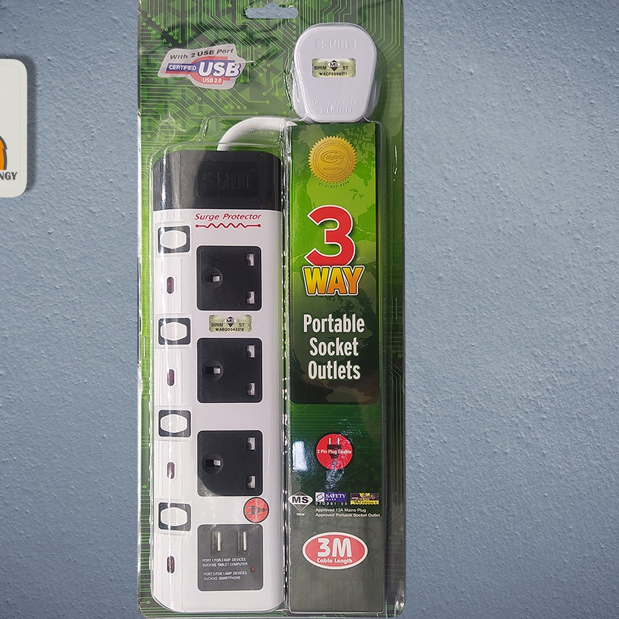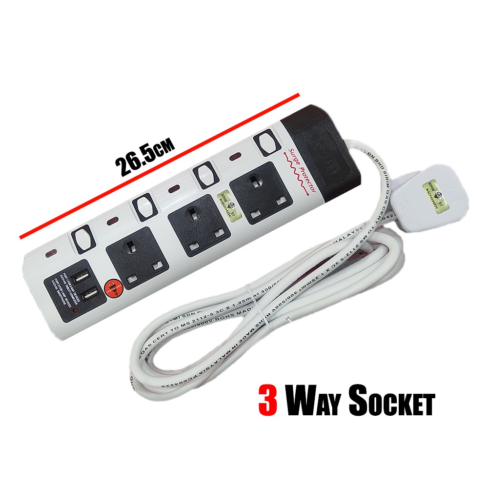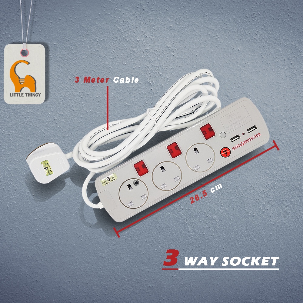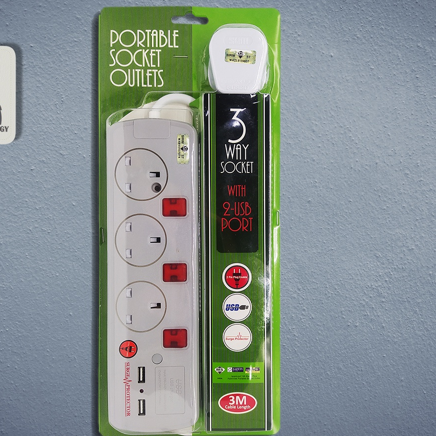 SIRIM Approval USB Extension Socket Plug, 2 USB Port With Surge Protector & 3 Meter Long Cable