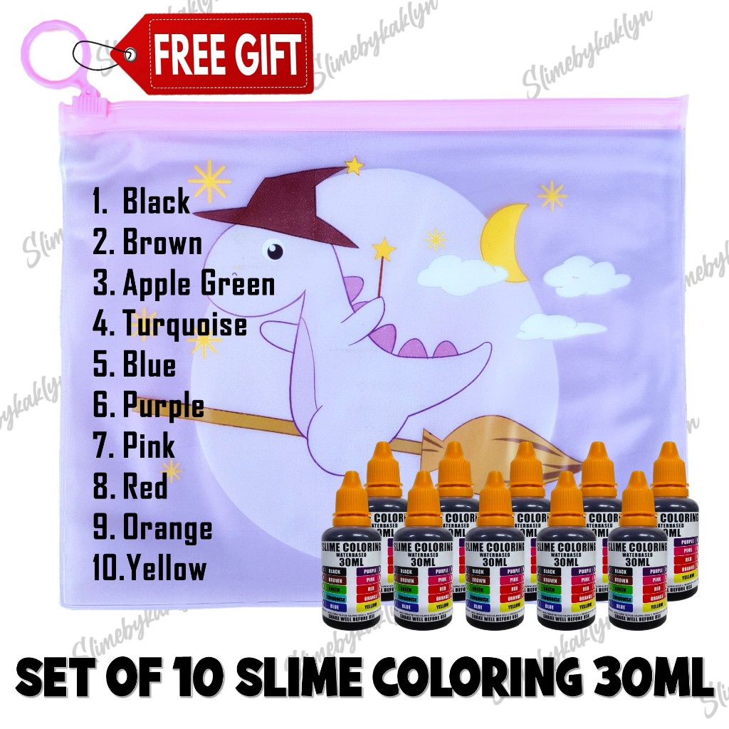 SLIME COLORING 30ML - SET OF 10 FOR DIY SLIME (GET DIFFERENT COLOR EACH) - BUY 1 SET GET 1 FREE DINO BAG - slimebykaklyn
