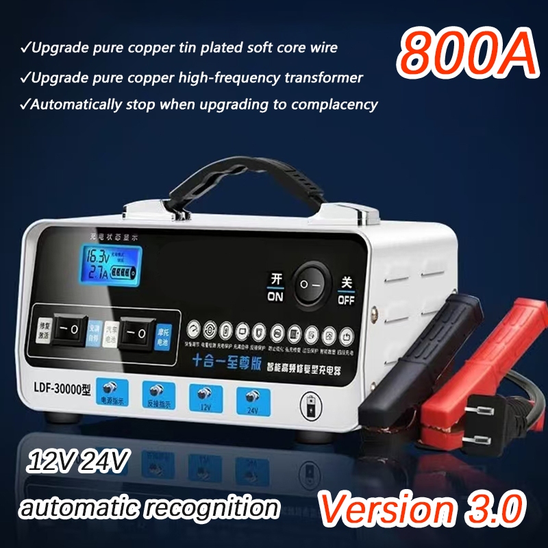 SOARFLY 800A Car battery Charger Bateri Kereta Universal Lorry Car Motor Pulse Repair Charge Pengecas Bateri 3Pin Plug 2Crocodile Clip 12V 24V