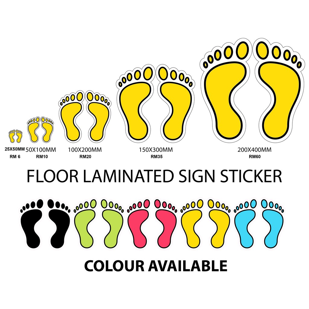 SOCIAL DISTANCING FOOT PRINT FLOOR LAMINATED SIGN STICKER 25X50MM, 50X100MM, 100X200MM, 150X300MM, 200X400MM