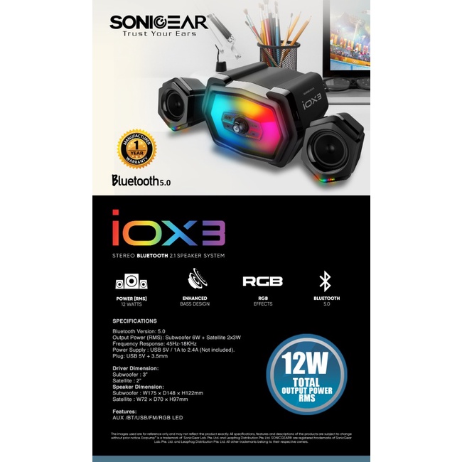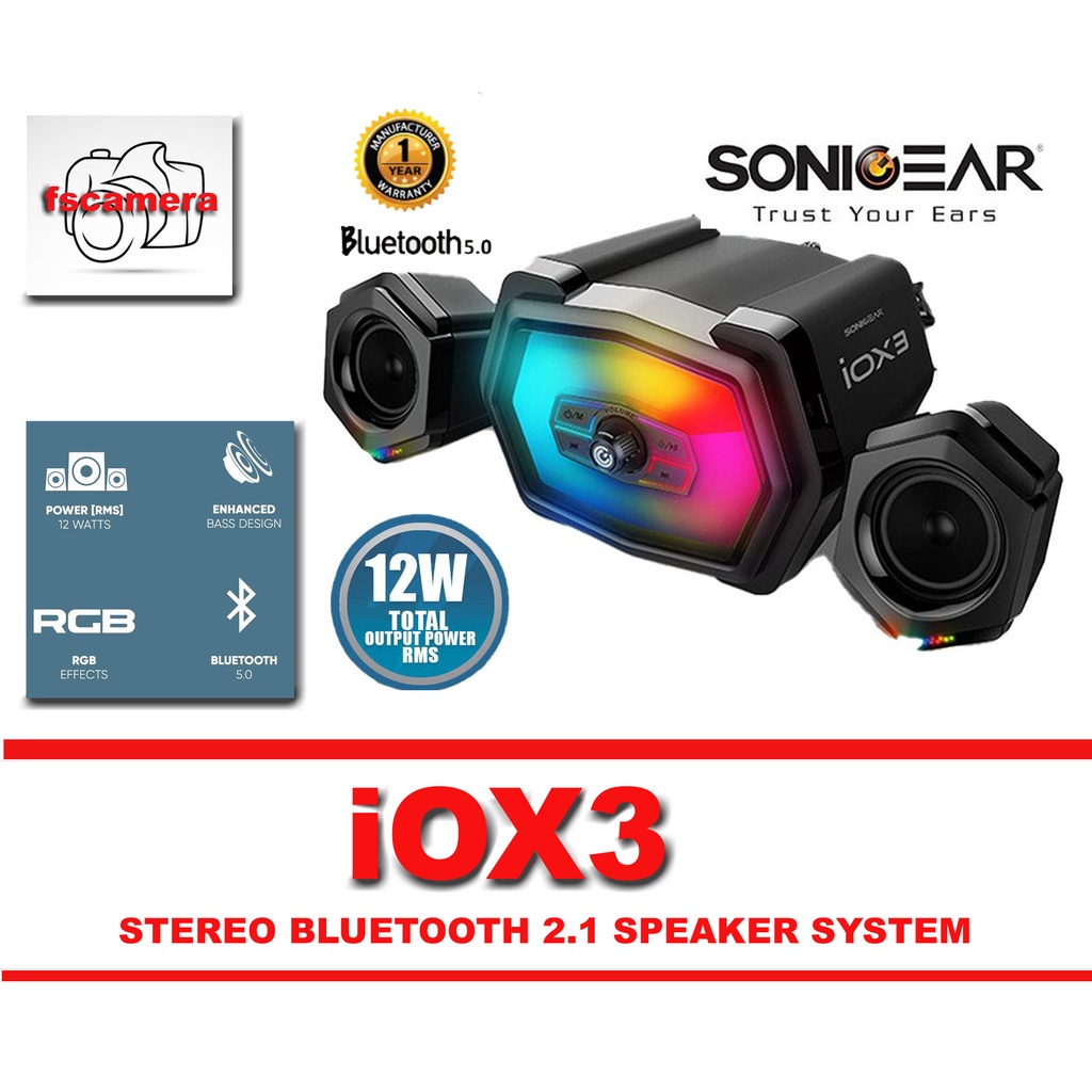 SONICGEAR IOX3 STEREO BLUTOOTH 2.1 SPEAKER SYSTEM TOTAL SYSTEM POWER 12RMS WITH RGB EFFECT