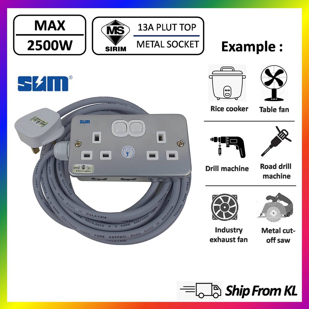 SUM Double Heavy Duty Metal Clad 13A Twin Switch Socket Extension Trailing Wire Cable leads 40/0.0076 X 3 Coils