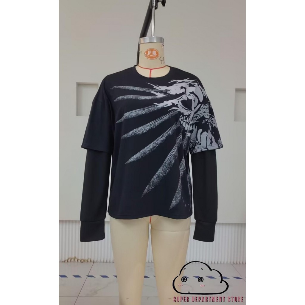 SUPER-Vintage Graphic Print Tops Women Halloween Clothes 2000s Skull Grunge Layered Sleeve Y2K Aesthetic Emo Mall Goth T-shirt