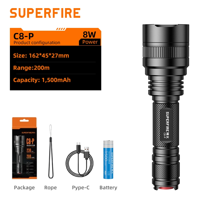SUPERFIRE C8-XPE 5W Highlight Outdoor Torch Light Rechargeable Flashlight With 1500mAh Battery LED Torch