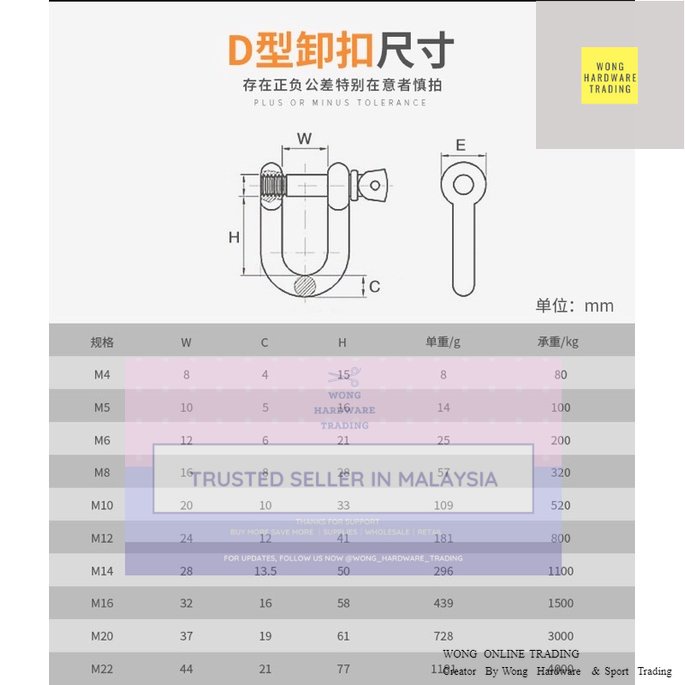 SUS 304 D Shackle High Quality SUS 304 M4 M5 M6 M8 Shackle Stainless Steel 304 U shape Buckle Type D Shackle Carabiner