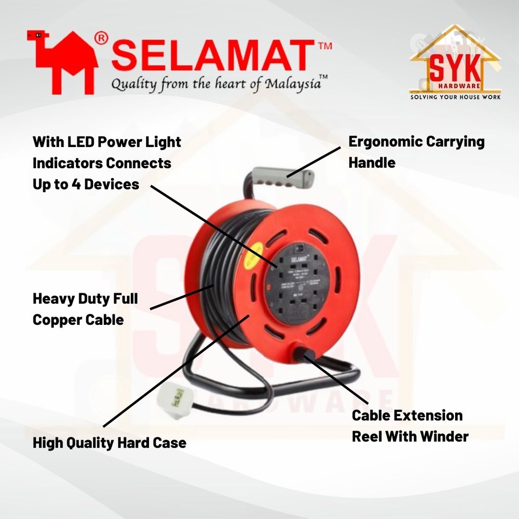 SYK SELAMAT 4 Gang 40 Meter Portable Extension Cable Reel Plug Wire Heavy Duty Extension Cord Penyambung Wayar Extension