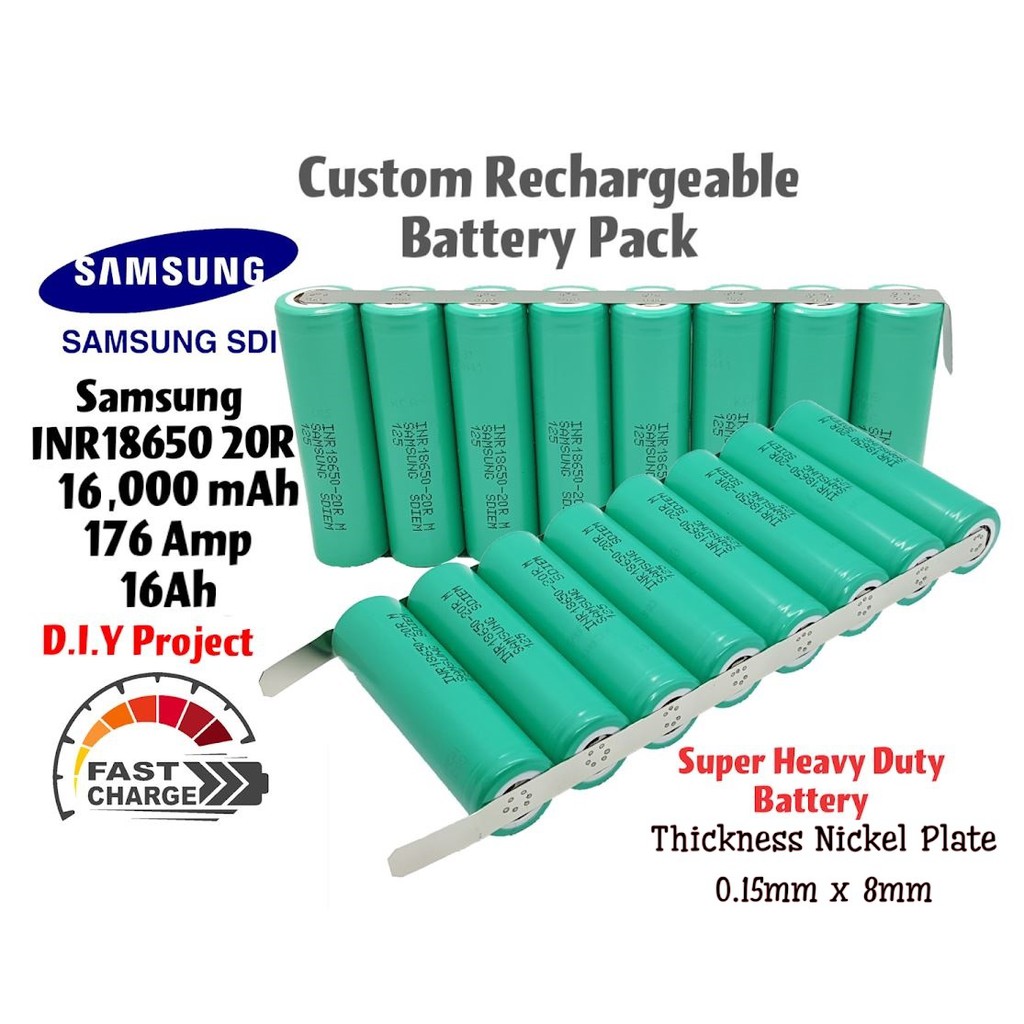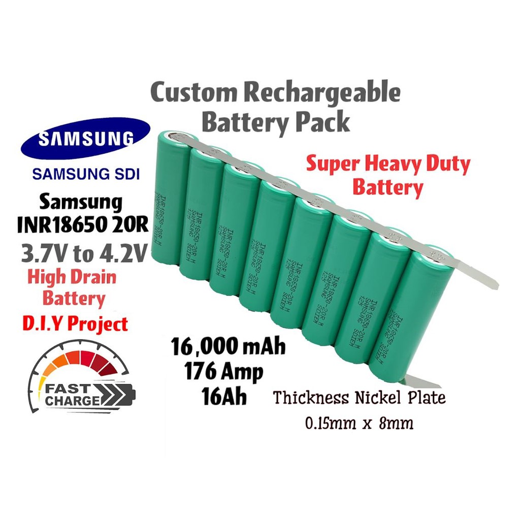 Samsung 18650 Battery Pack Custom DIY Lithium Ion INR18650 20R Heavy Duty With Spot Welding 16000mAh 16Ah 176Amp 1S8P