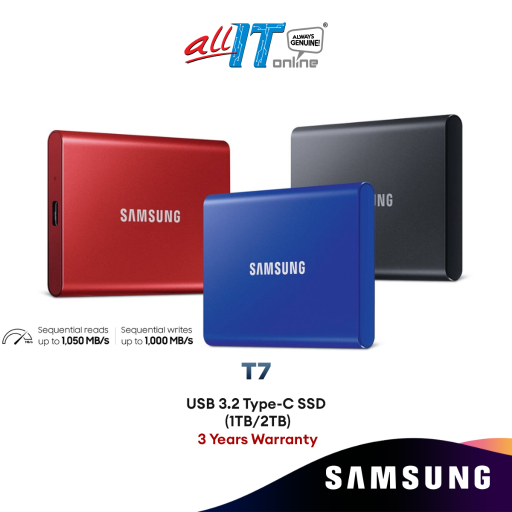 Samsung T7 USB 3.2 Type-C Gen 2 10Gbps External Portable SSD (1TB/2TB) - Blue/Grey/Red