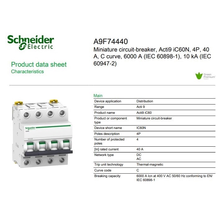Schneider Electric Acti9 IC60N A9F74440 40A 4P Miniature Circuit Breaker C Curve