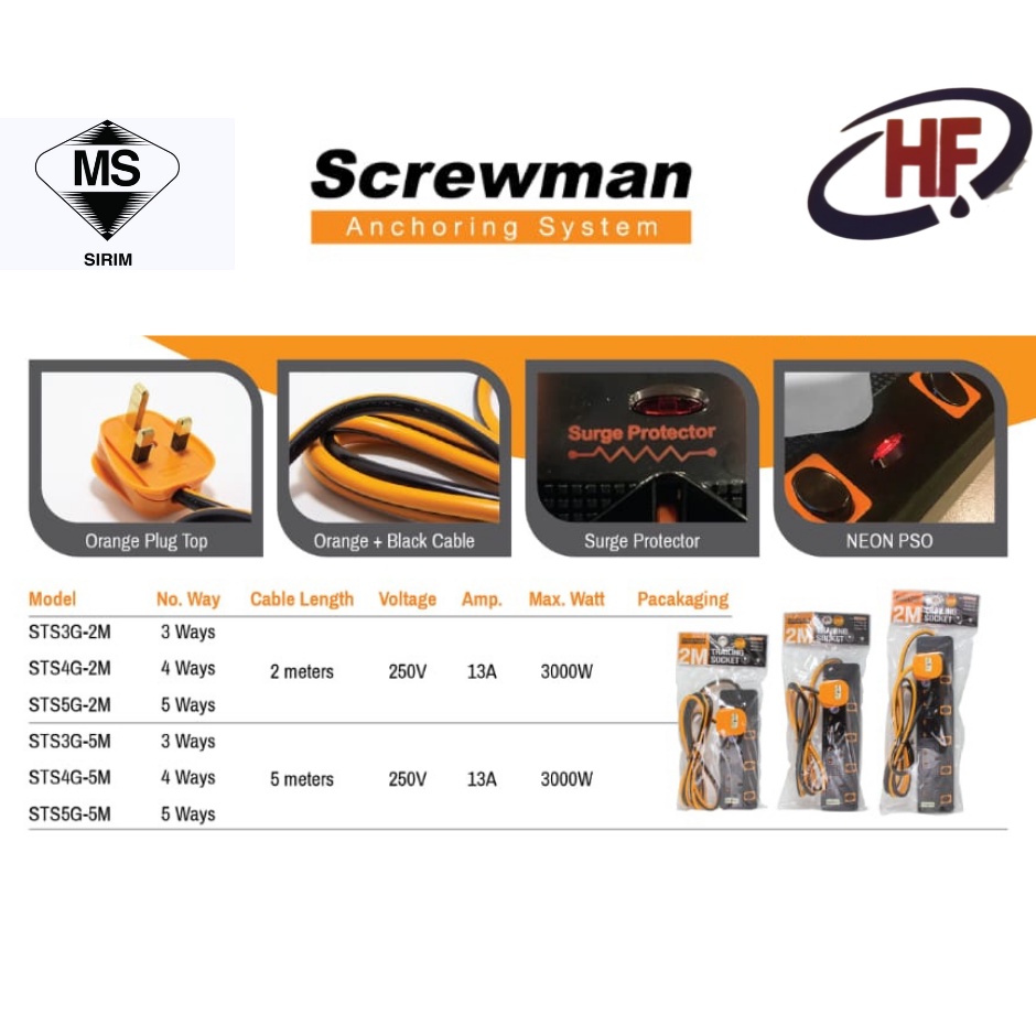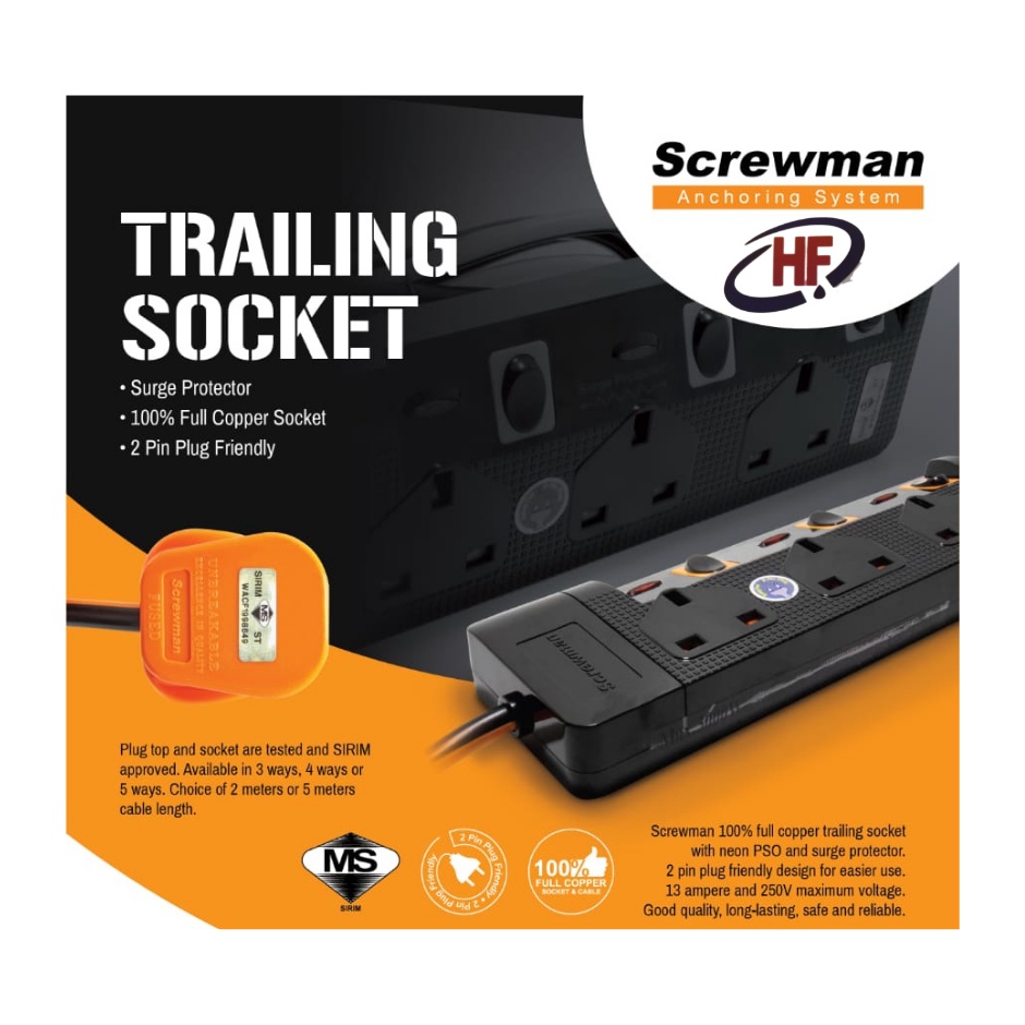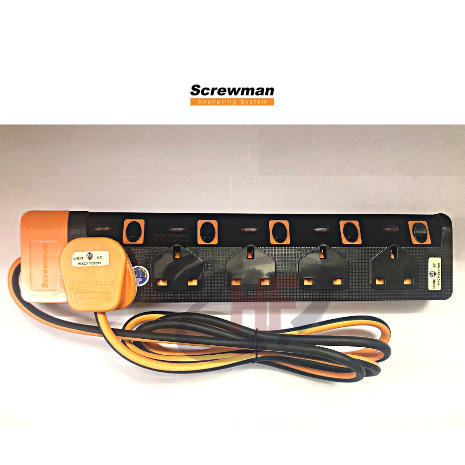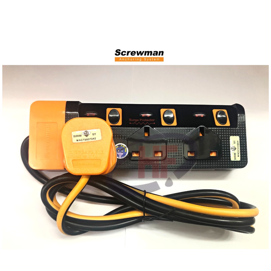 Screwman 3G / 4G / 5G Medium Duty Trailing Socket extension with Surge Protector (2meter)
