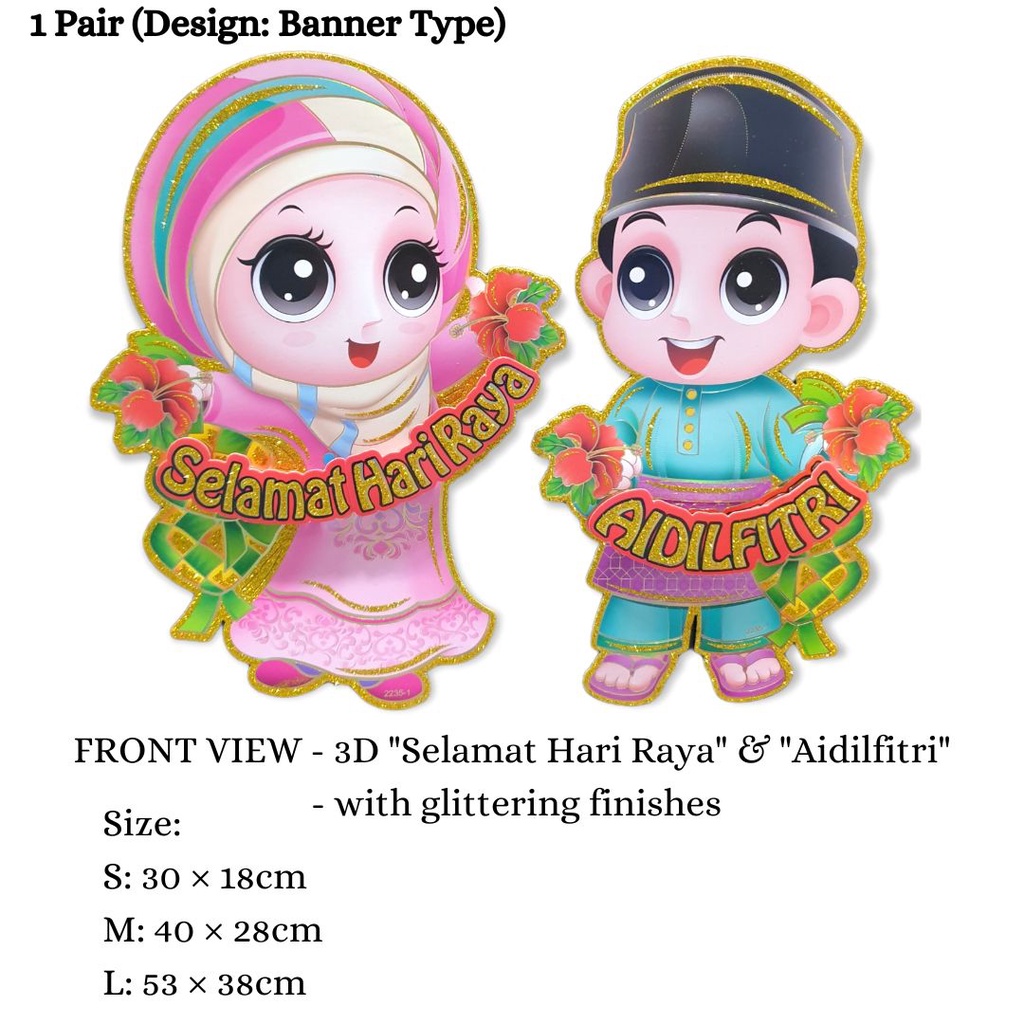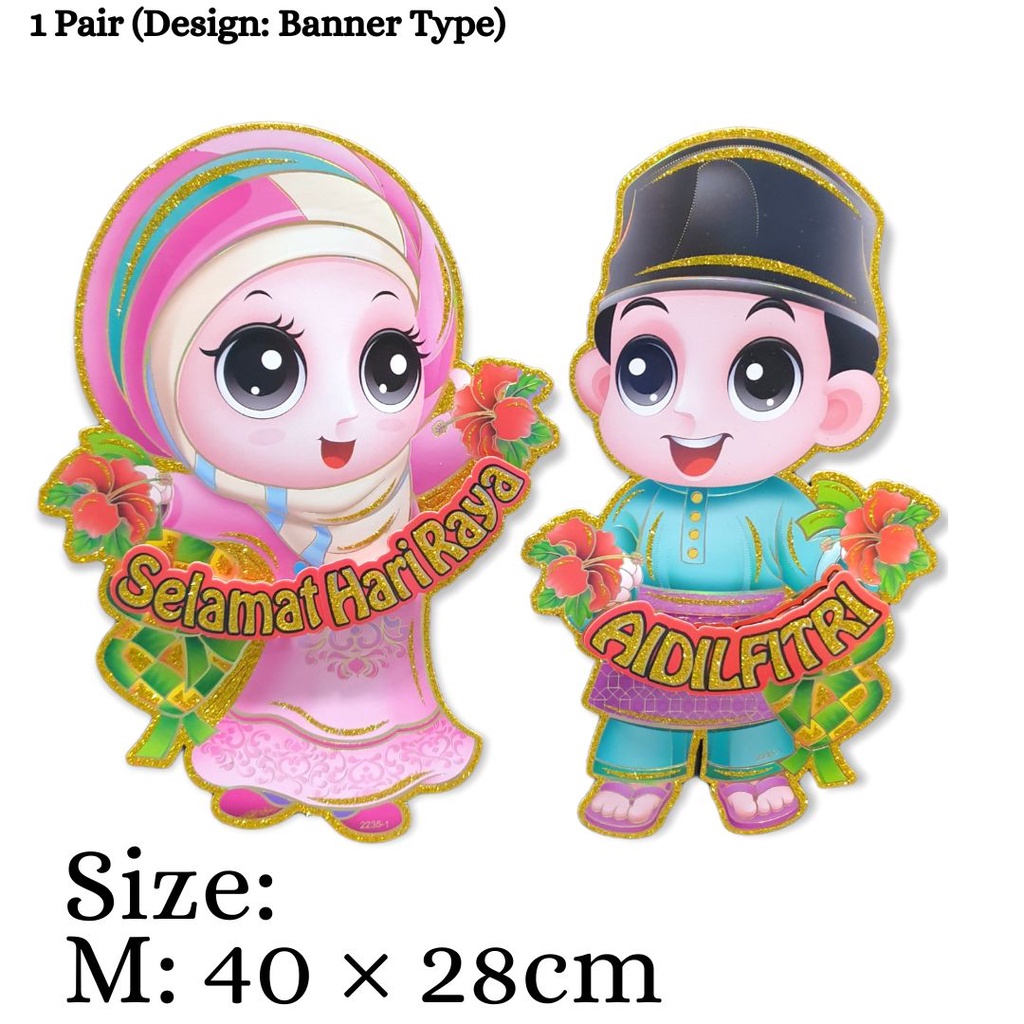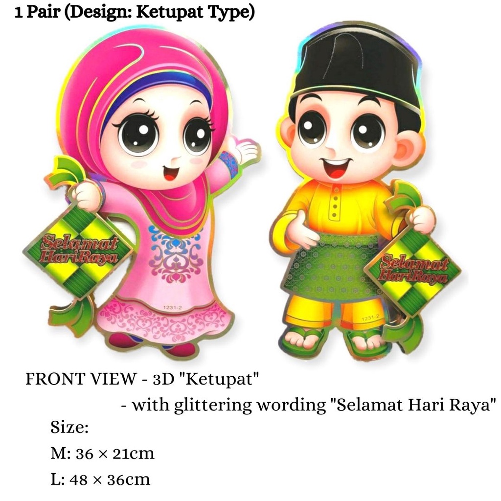 Sepasang 3D Kad Decor Hiasan Cartoon Budak Hari Raya Aidilfitri Sesuai Untuk Tampal Dinding / Pintu