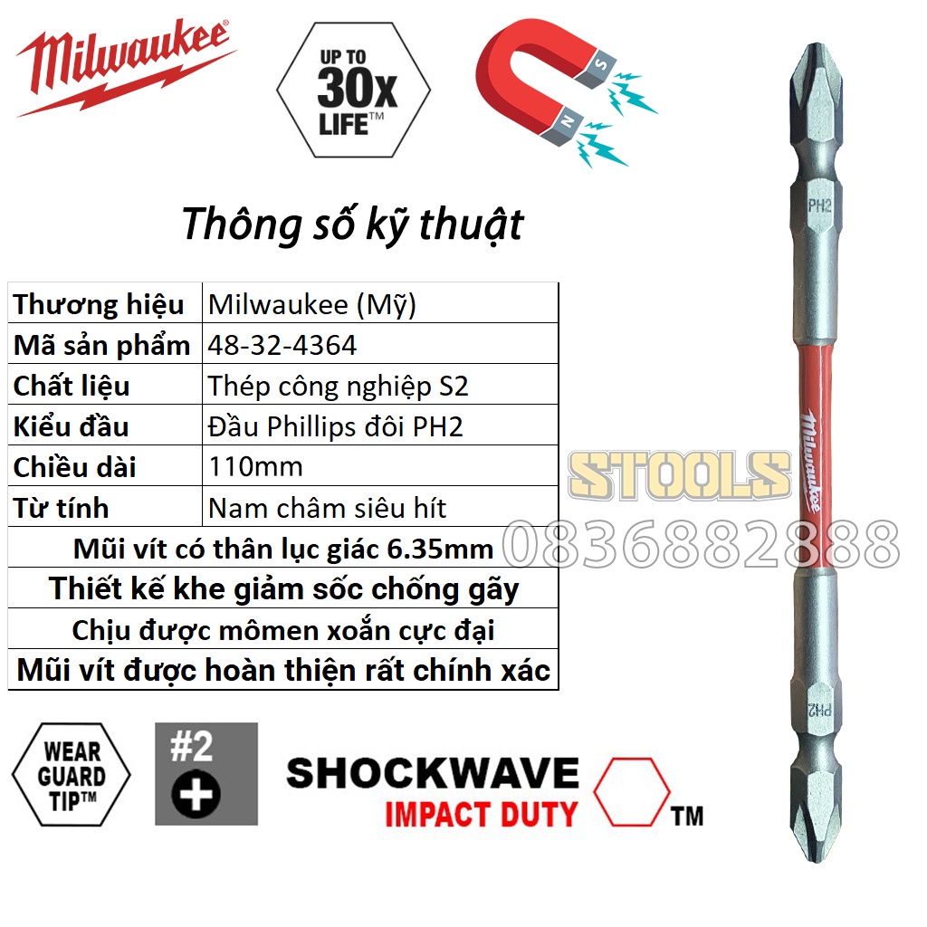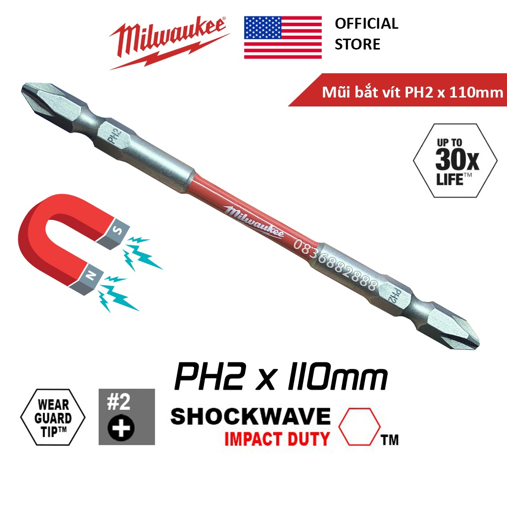 Set of 10 genuine American Milwaukee 110mm long double-headed screwdriver bits, super durable PH2 screwdriver bits with 2 heads and 4 sides, super hard magnetic bake