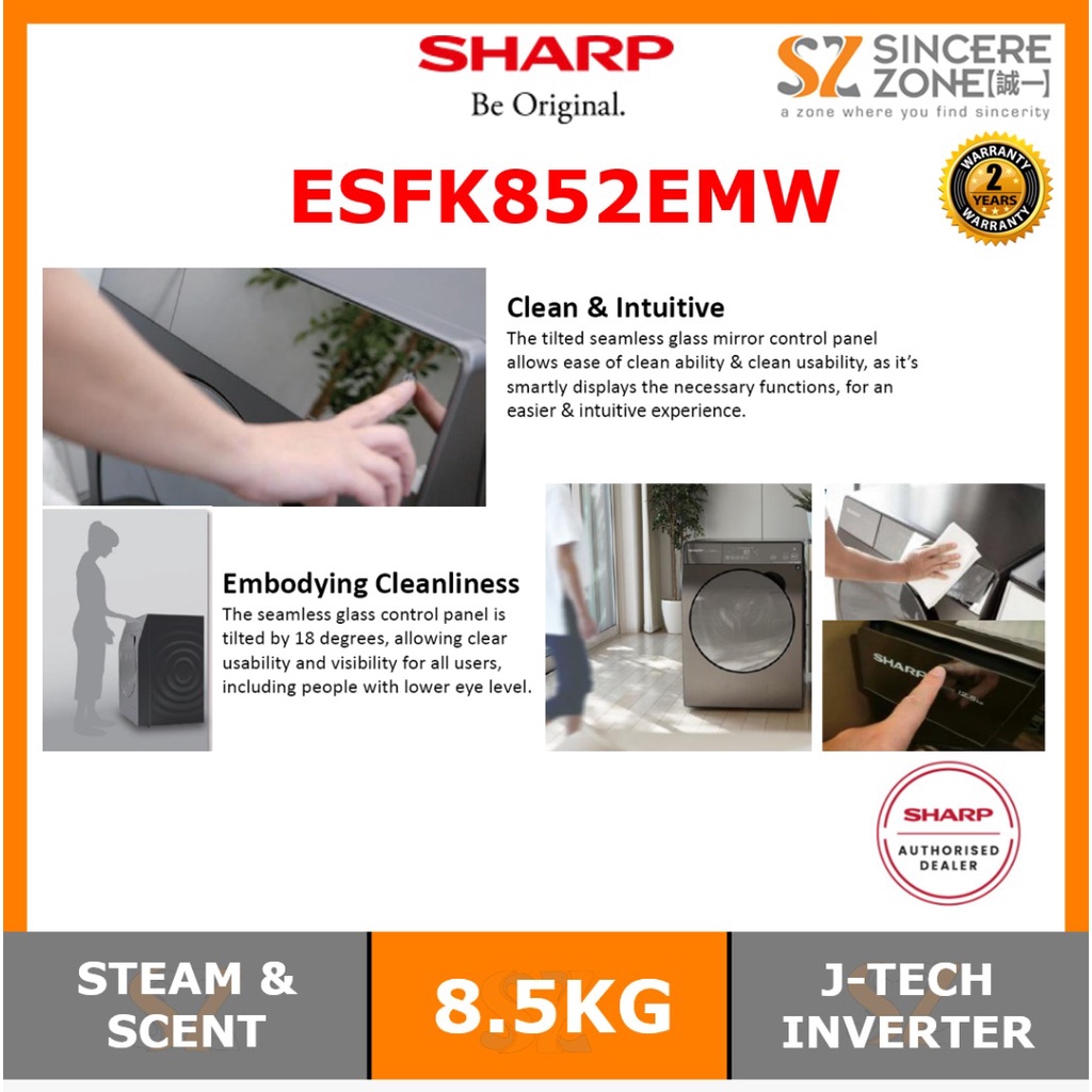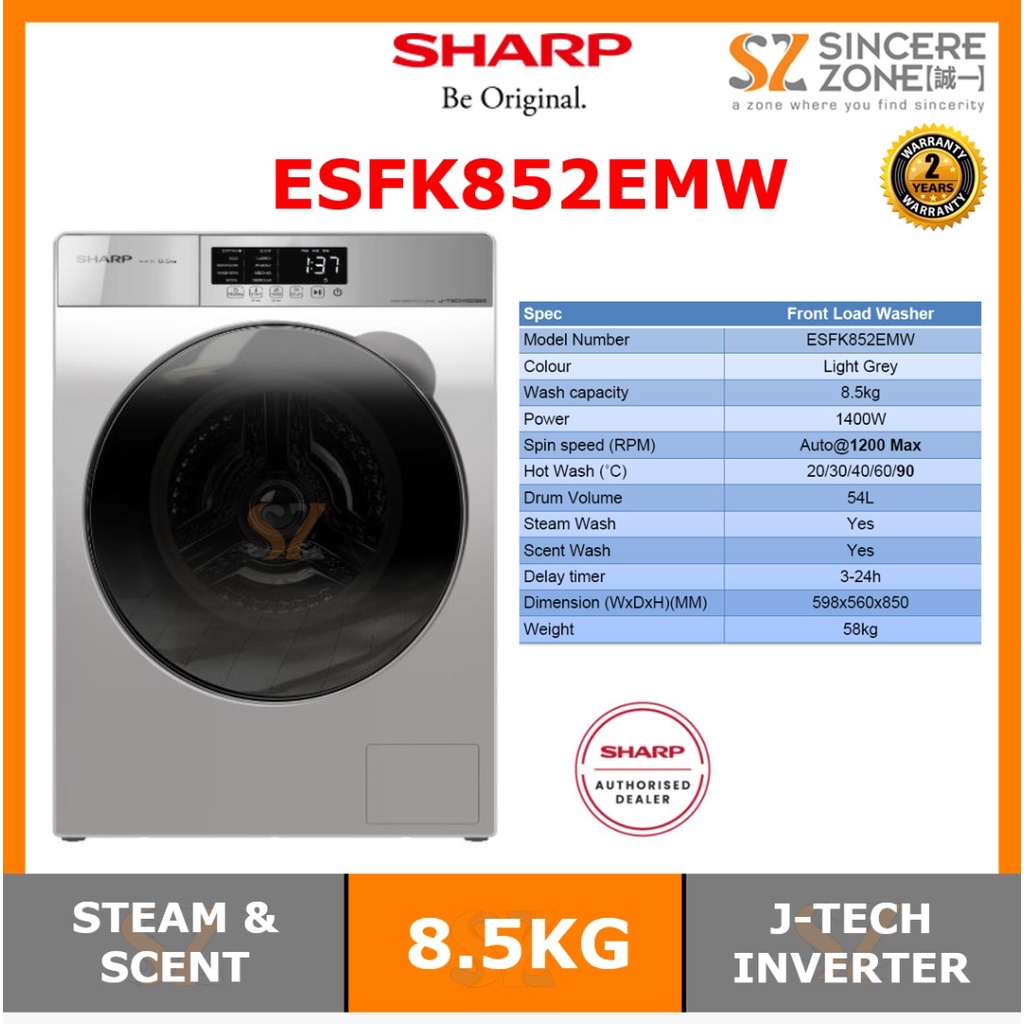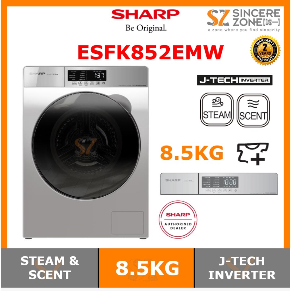 Sharp ESFK852EMW 8.5KG J-Tech Inverter / Touch Control Panel, Scent / One Touch Open Detergent Compartment