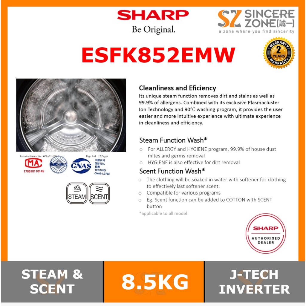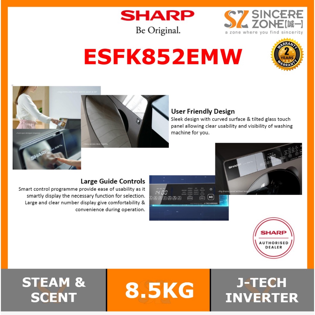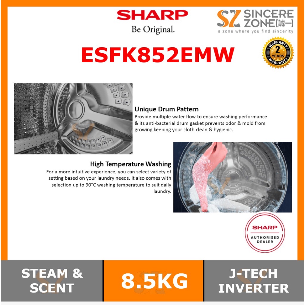 Sharp ESFK852EMW 8.5KG J-Tech Inverter / Touch Control Panel, Scent / One Touch Open Detergent Compartment