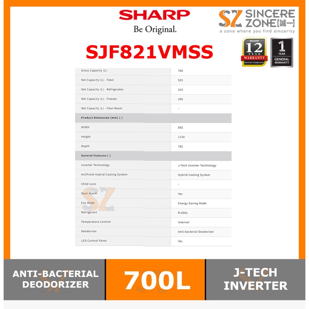 Sharp SJF821VMSS 700L Avance Series 4 Door Refrigerator