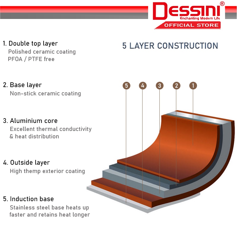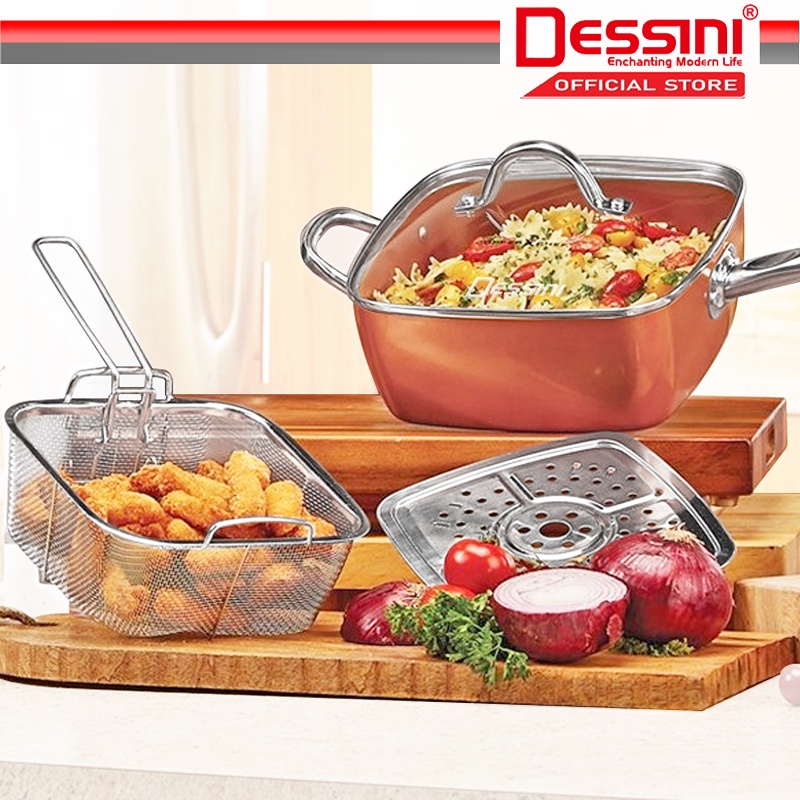 DESSINI ITALY Zero Fat 4 Pcs Aluminium Induction Non Stick Copper Casserole Pot Bowl Deep Frying Pan Basket + Steamer
