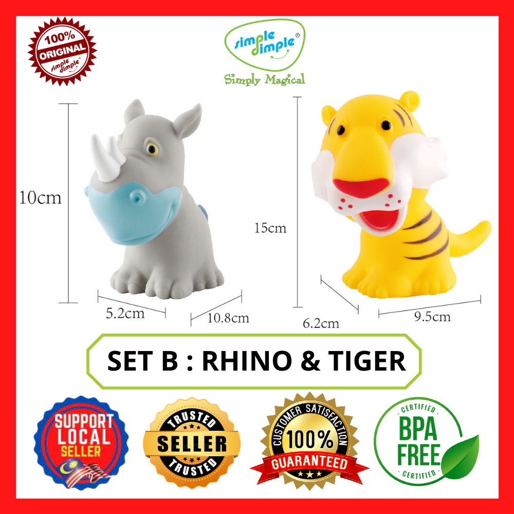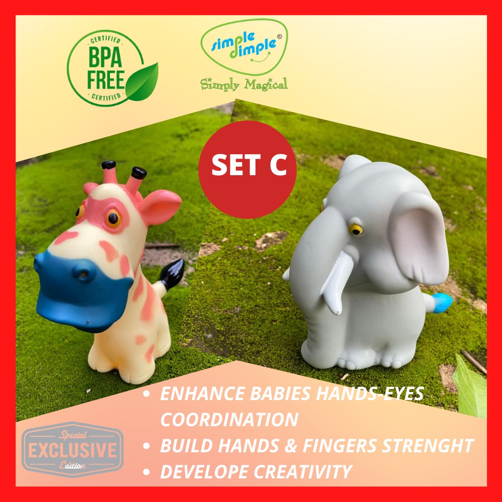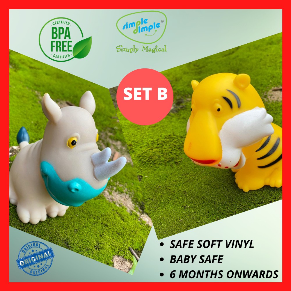 Simple Dimple 1st Toy Premium Animals Safari Vinyl Toy (2 pcs Set) Soft Squeeze Animal Baby Bath Toys Baby Safe BPA free