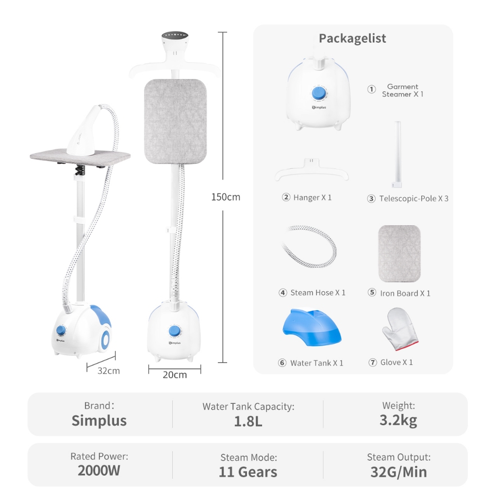 【Exclusive Price】Simplus 2 in 1 Garment Steamer丨2000W丨 11-Iron Mode丨34g/min Steam Output丨Stainless Steel Soleplate