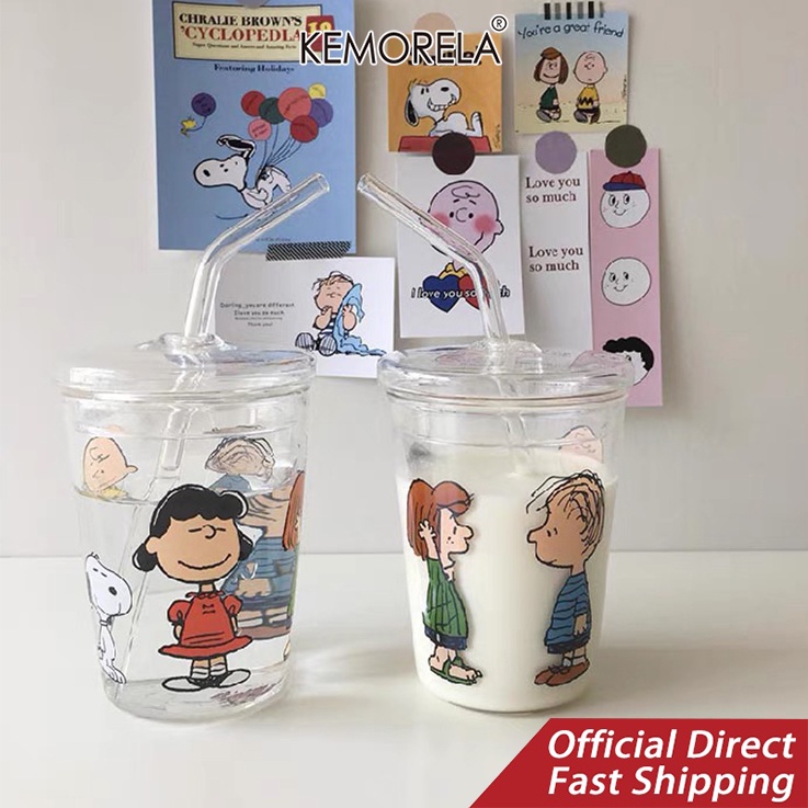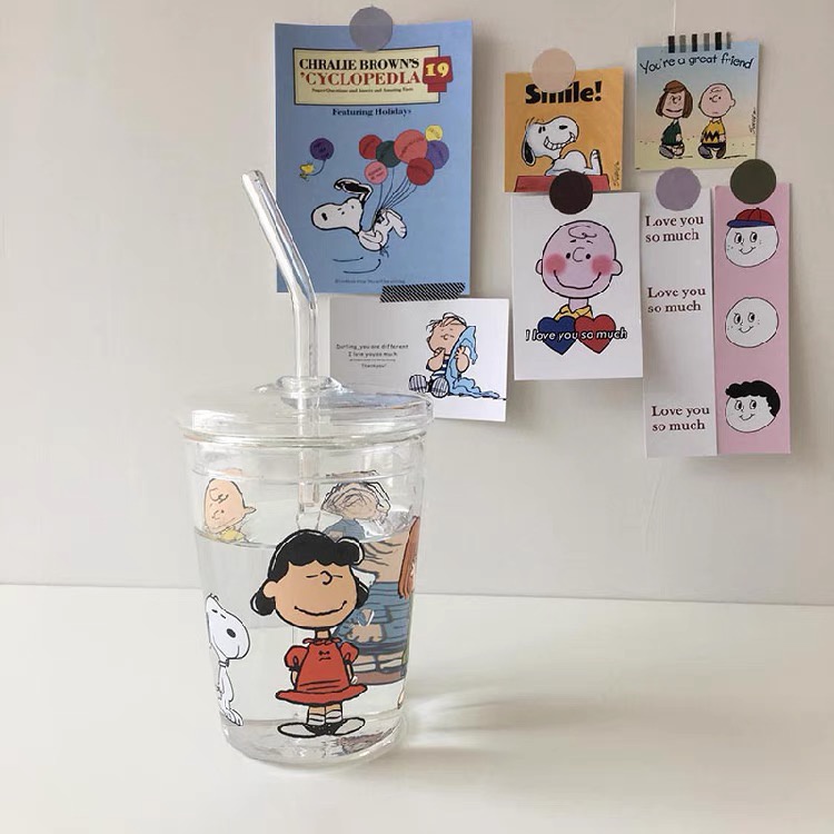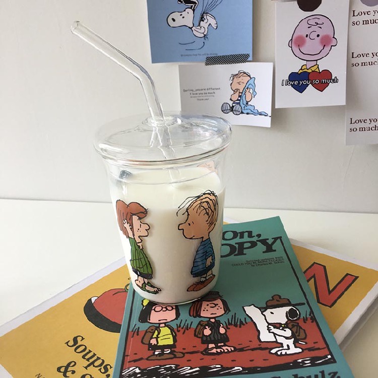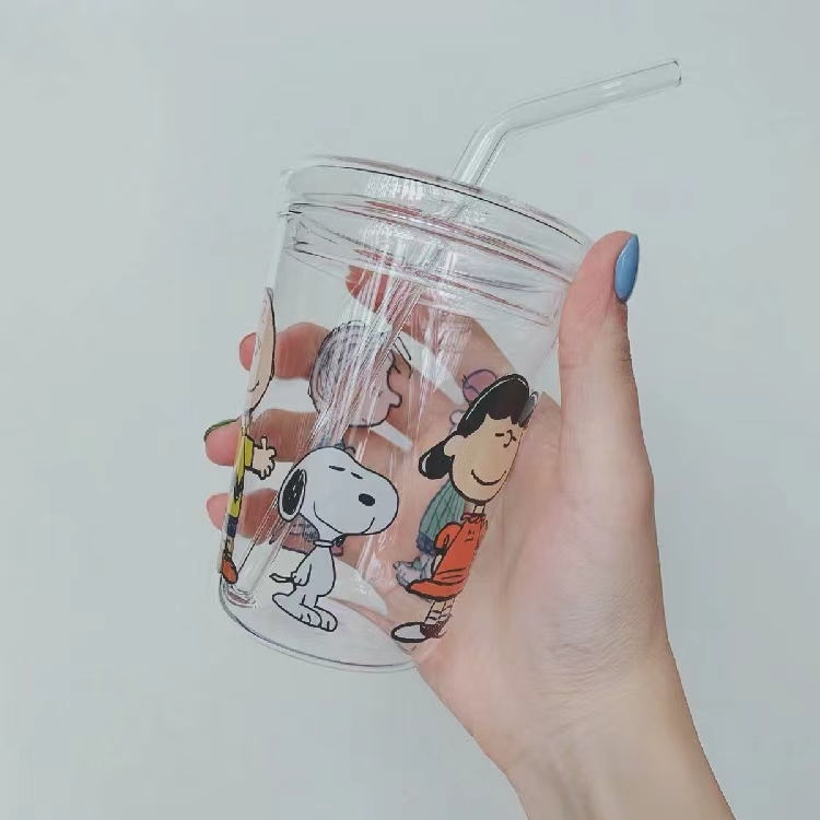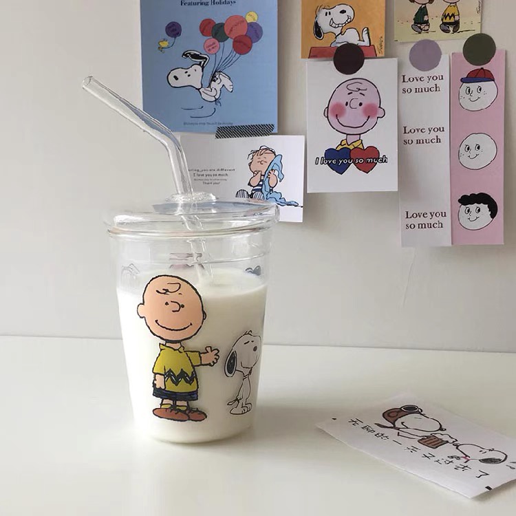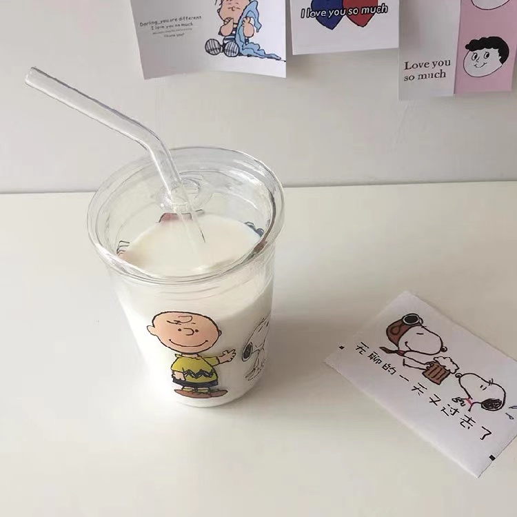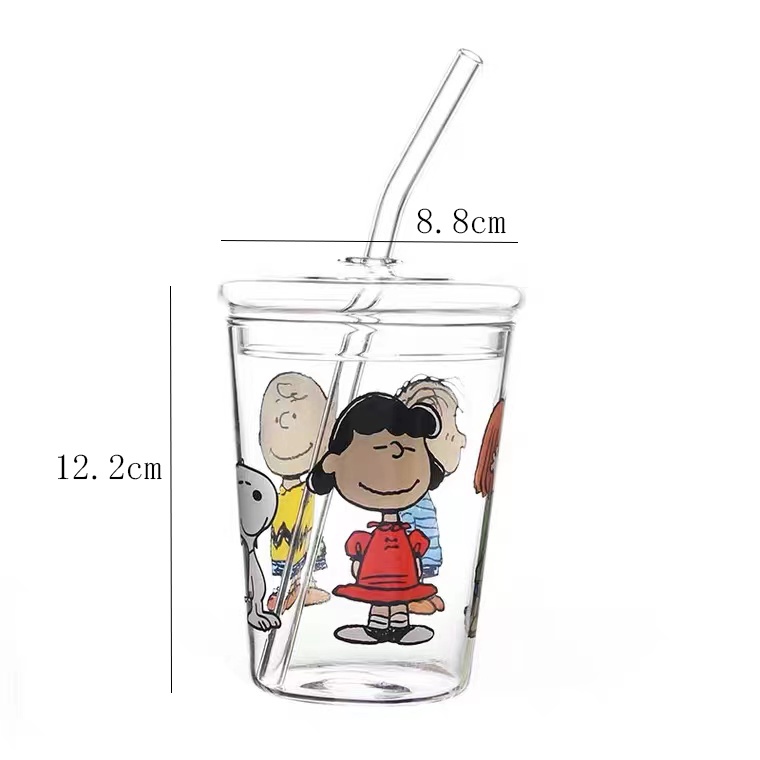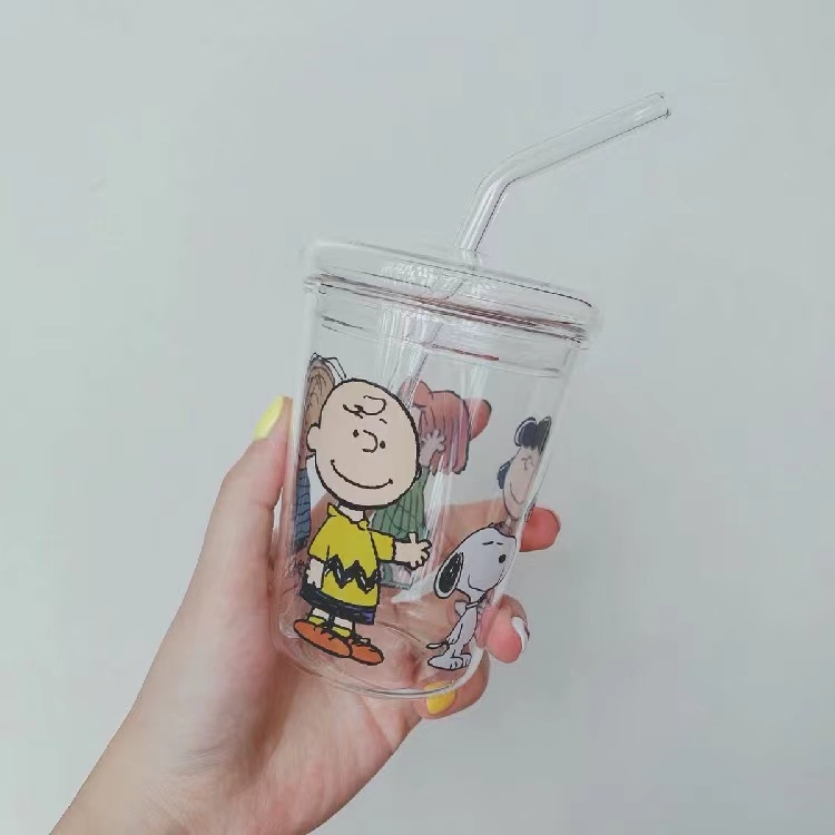 Snoopy glass sippy cup Cartoon cute water cup with straw non-stick cup student cup straw glass cartoon charlie glass