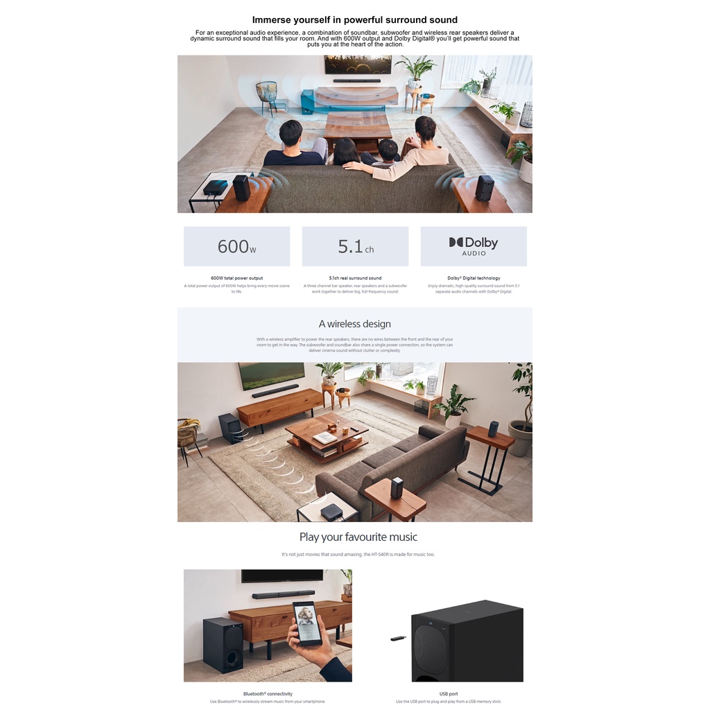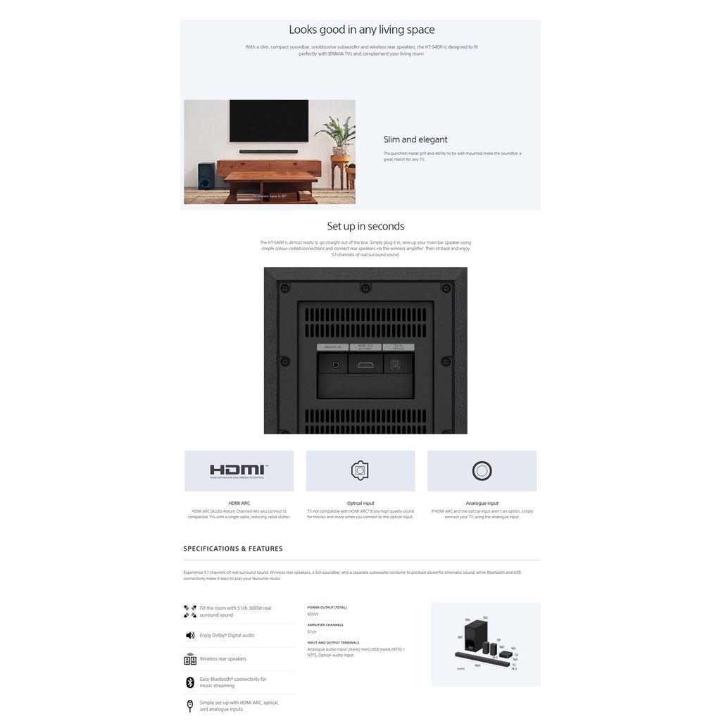 Sony 5.1ch Real Surround Sound Home Cinema Soundbar System HT-S40R Wireless Rear Sound Bar Bluetooth Dolby Audio HTS40R