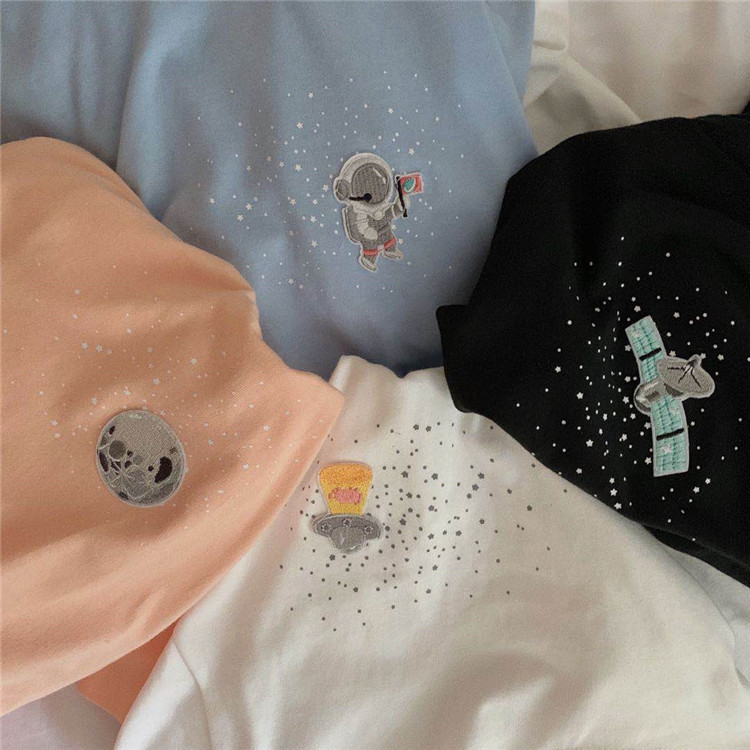 Spring Summer Women's Loose Cotton Star Astronaut Pattern Embroidery Retro Funny Beautiful Colors Round Neck Loose T-shirt Korean Short Sleeve Cute Soft Shirt Tops Baju Murah