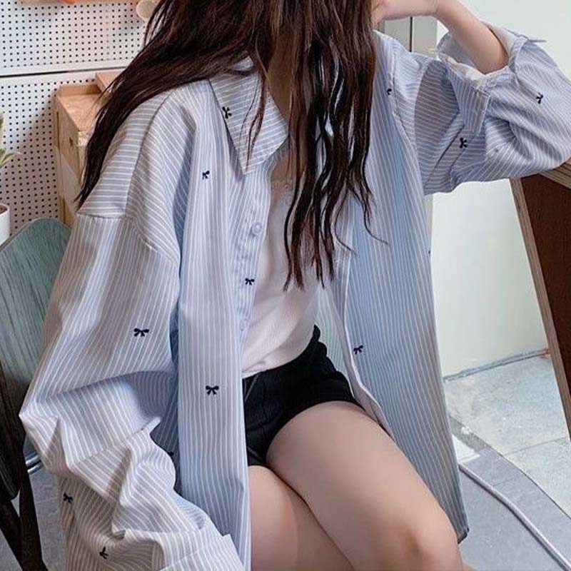 SL Striped Women Long Sleeved Shirt Loose Blue White Casual Bow Print Top