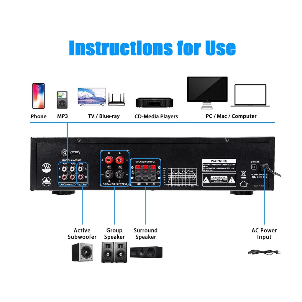 Sunbuck 5CH HiFi Power Amplifiers Stereo bluetooth 5.1 Home Audio Digital Sound Amplifier BASS Music Player FM USB SD 3M