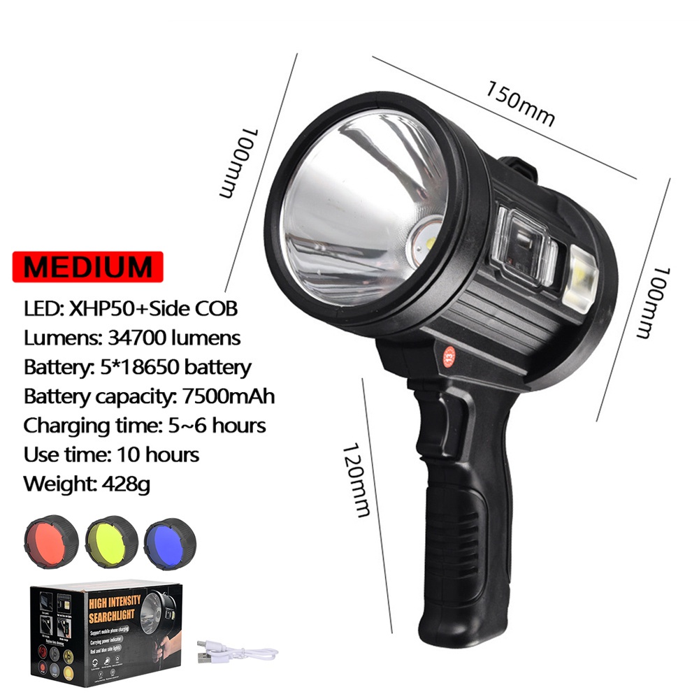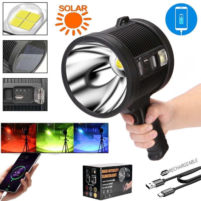 Super Powerful Portable Solar Red+Blue+Yellow Searchlight Led Flashlight Spotlight Type-C Charging Output Torch For Outdoor