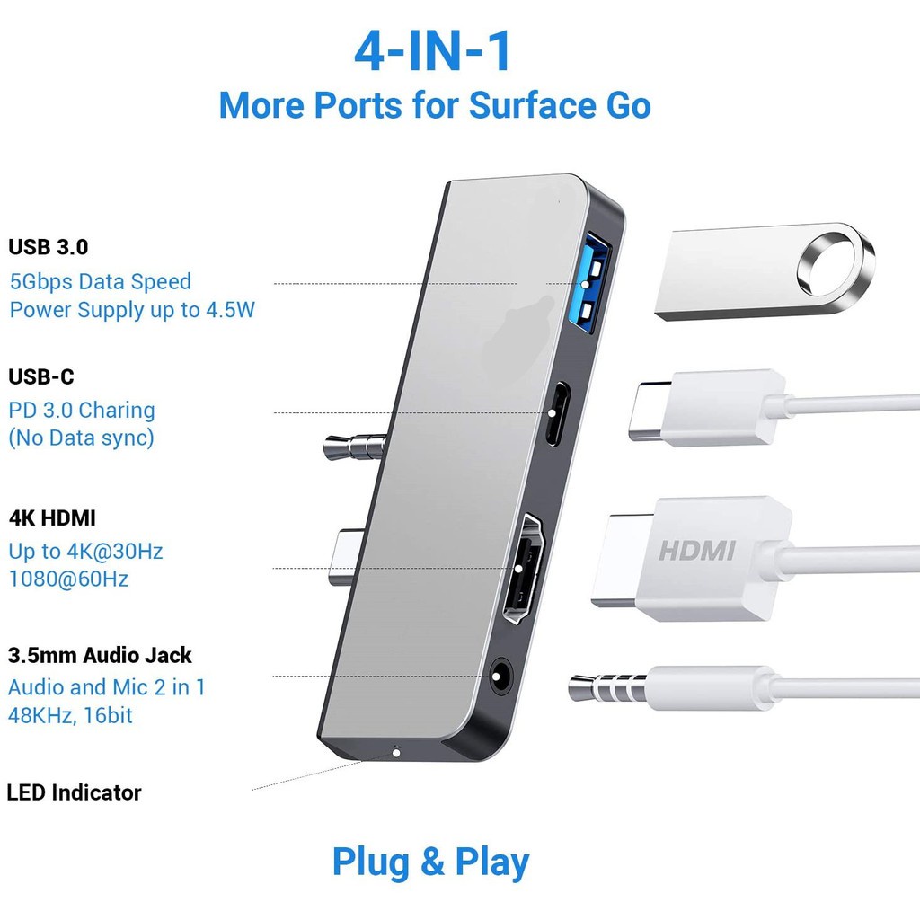 Surface Go Go 2 Go 3 Hub, 4-in-1 Dock 4K HDMI Adapter, PD Charging, type c USB 3.0, 3.5mm Audio Jack Docking Station