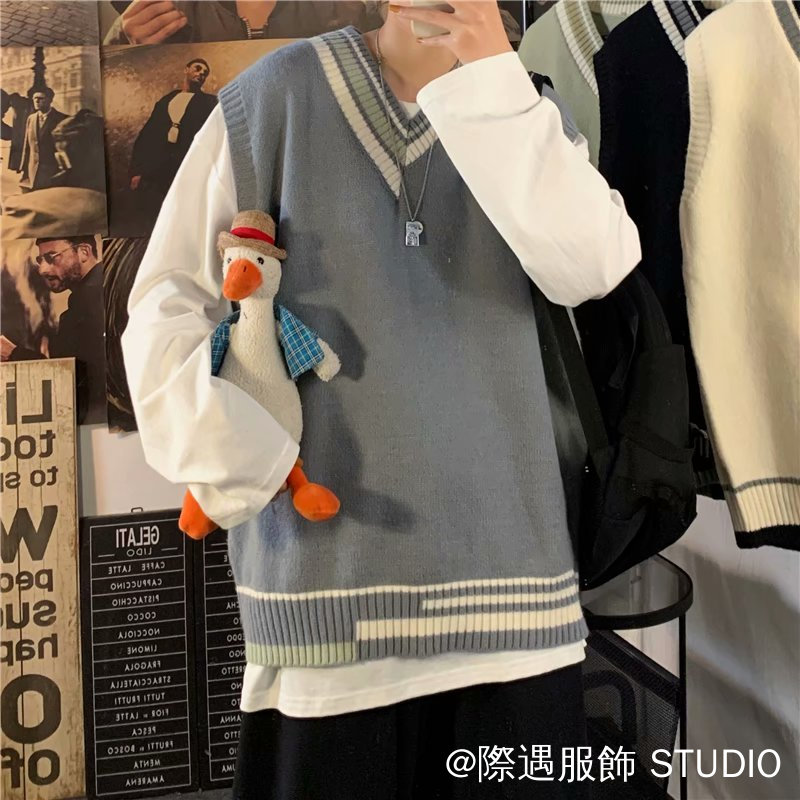 Sweater Vest 4 Colors Autumn Winter Sweater Vest Men Street Wear Hong Kong Style Couple Sweater Vest Korean Version Trendy Preppy Style V-Neck Sweater Waistco