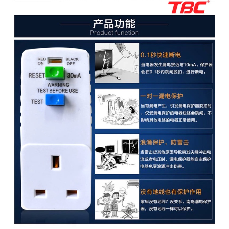 TBC Safety ( ELCB ) Plugin Socket 13A Adaptor Power - Sirim -