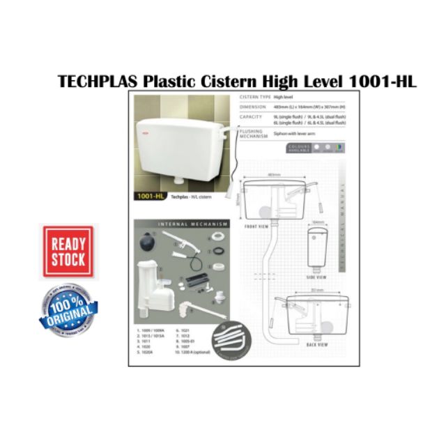 TECHPLAS 9LITER Elegen Plastic Cistern High Level 1104-HL/Tangki Jamban